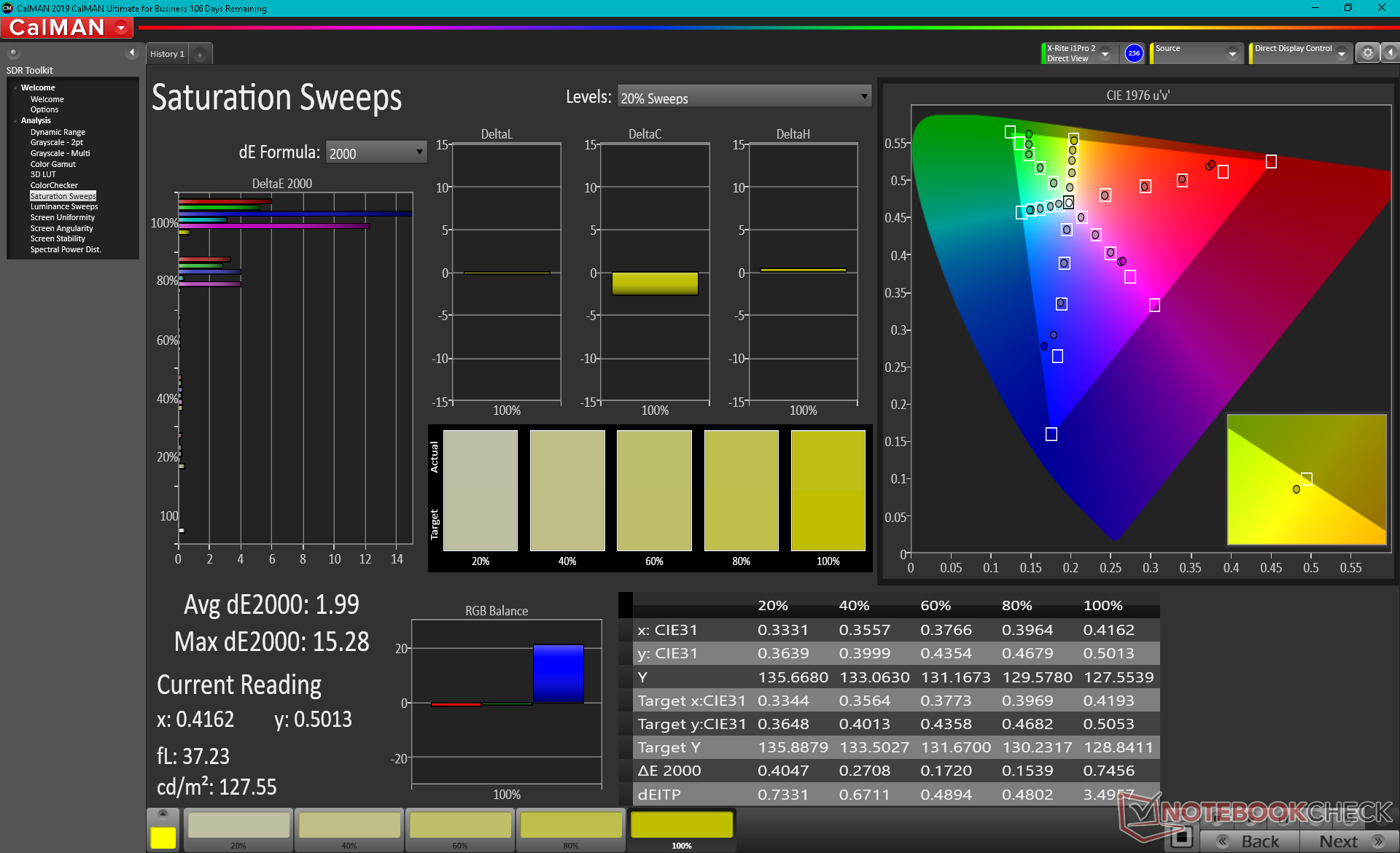 | Colorchecker dE 2000 calibrated * | 1.56 | 4.73 -203% | 3.71 -138% | 1.45 7% | 3.78 -142% | 1 36% |