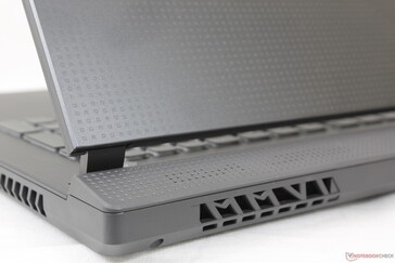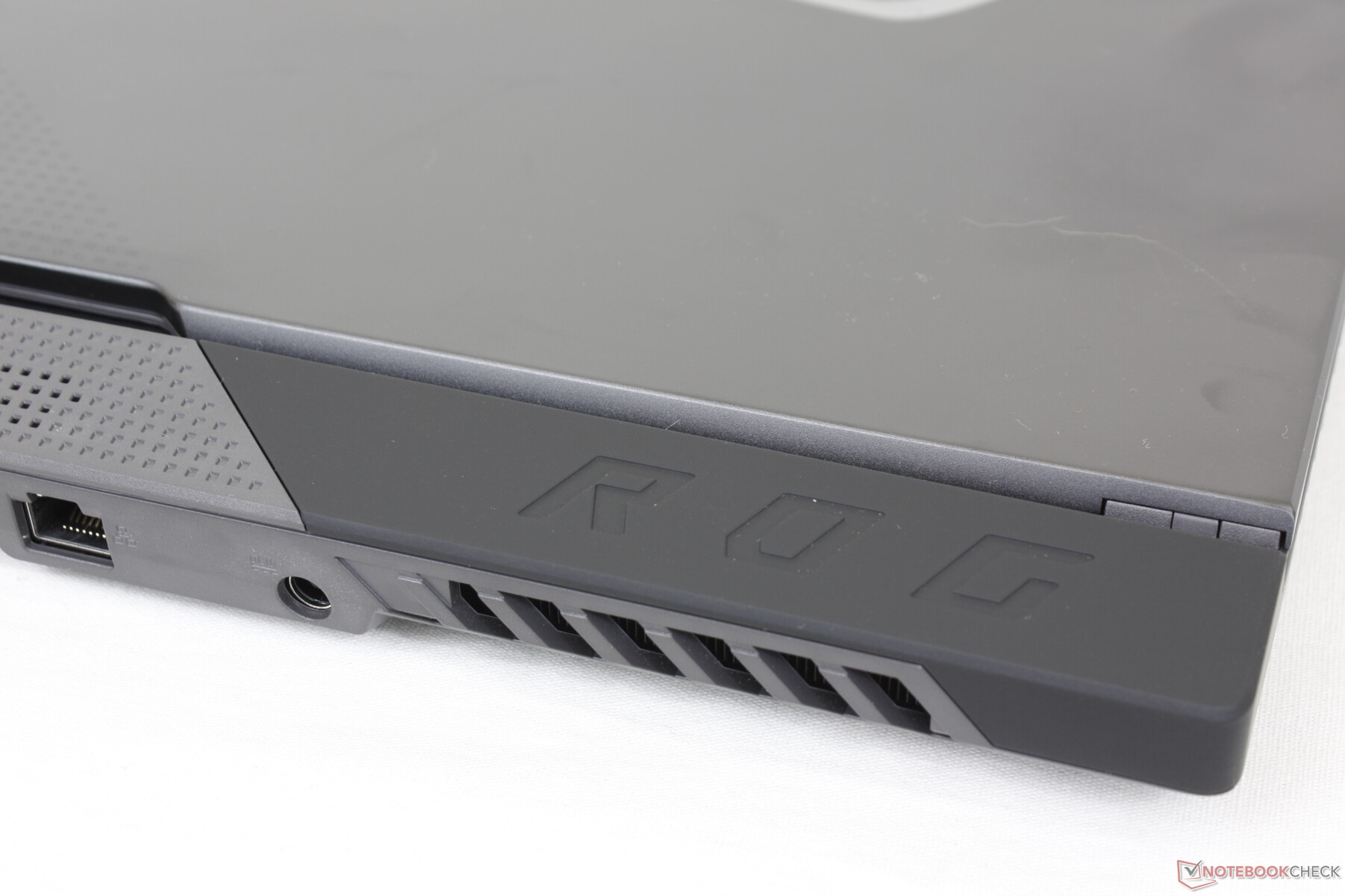 Da die vielen ROG-Strix-Modelle das gleiche optische Design besitzen, sind sie schwer auseinanderzuhalten. Das herausstehende Heck, die großen, markanten Scharniere, der dicke untere Bildschirmrand, die leicht gummierte Tastaturgrundfläche und das Fehlen einer Webcam sind der Reihe erhalten geblieben. Die größten Unterschiede findet man beim Design, da bestimmte Elemente des Chassis flacher und glatter sind, was insgesamt in einer schickeren Optik resultiert. Die rechte Kante und die Deckelaußenseite zieren beispielsweise ein ROG-Muster, das es bei älteren Modellen noch nicht gab.