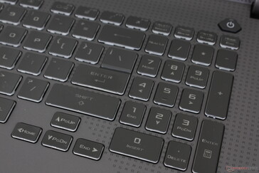 Ausgenommen die neuesten Flaggschiff-Modelle mit mechanischen Switches ist das Tippgefühl der meisten ROG-Strix-Laptops nahezu identisch, da sie alle auf ein ähnliches Chassis-Design setzen. Die Tasten bieten mehr Tastenhub und ein besseres Tastenfeedback als bei einem Razer Laptop, sind jedoch auch lauter als beim MSI Katana. Der Ziffernblock und die Pfeiltasten fallen auch hier wieder kleiner aus als die QWERTZ-Standardtasten, was ihre Bedienung weniger komfortabel macht.