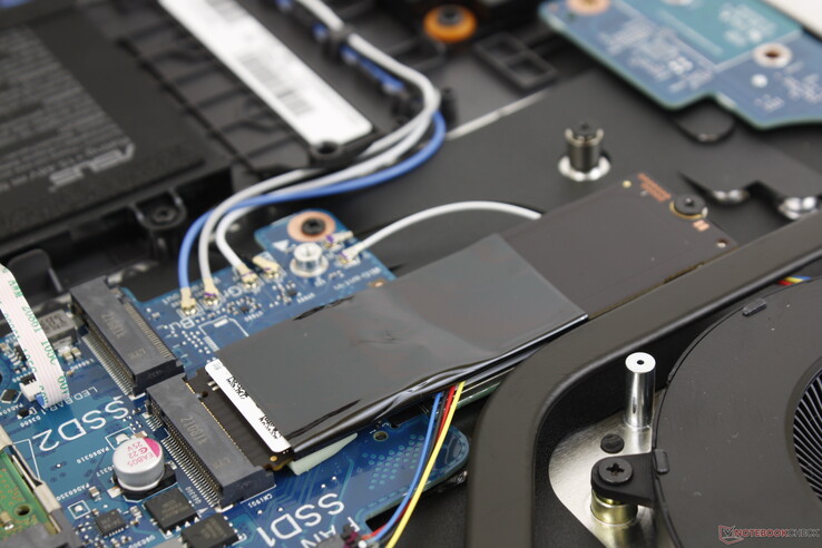 Bei der Wartung muss man vorsichtig sein, um die beiden empfindlichen Flachbandkabel, welche die Bodenplatte mit dem Motherboard verbinden, nicht zu beschädigen. Die Flachbandkabel dienen der Steuerung der RGB-LEDs an der Vorderkante des G713 und sind in dieser Form bei den meisten anderen Laptops nicht zu finden.