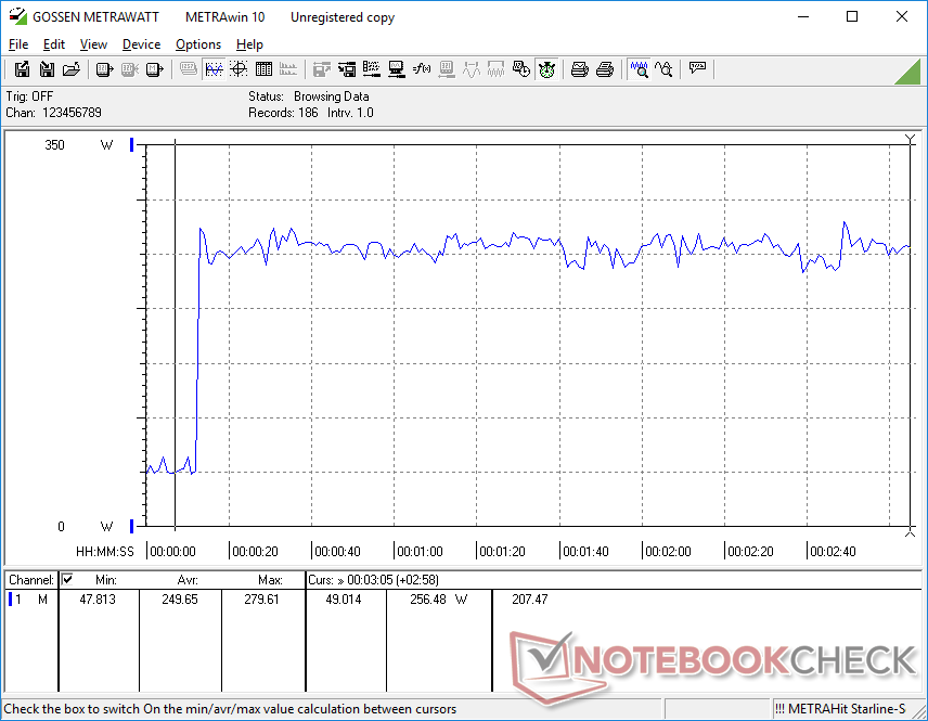 Wir konnten eine maximale Leistungsaufnahme von 280 W aus dem großen (~18,4 x 8,4 x 3,6 cm) 330-W-Netzteil aufzeichnen.