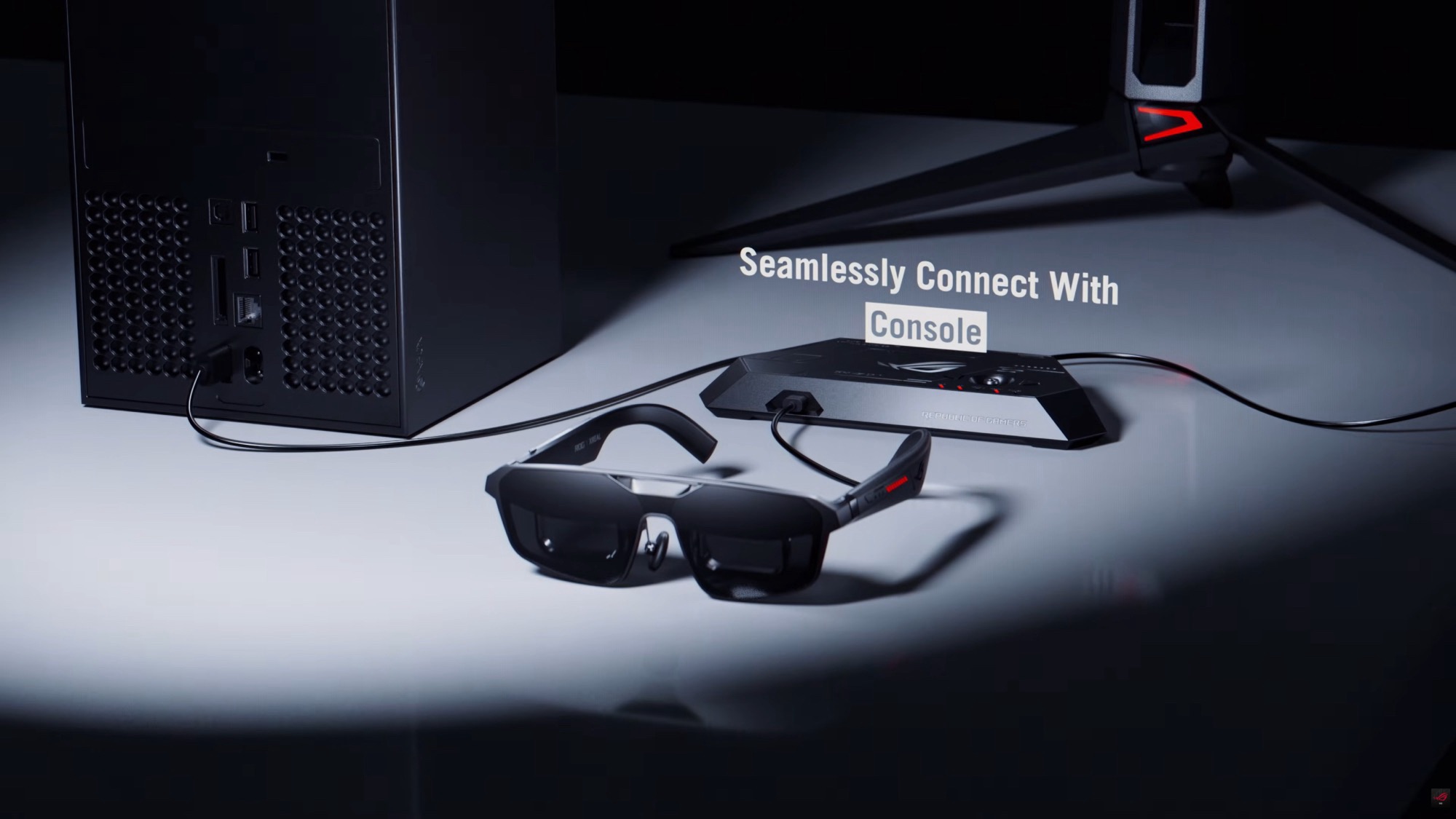 Das mitgelieferte ROG Control Dock erlaubt den Anschluss an einen Desktop-Computer oder an eine Heimkonsole wie die Sony PlayStation 5, denn das Dock besitzt zweimal HDMI 2.0 und einmal DisplayPort 1.4. Nutzende können auf Knopfdruck zwischen angeschlossenen Geräten umschalten, die Videobrille wird an den USB-C-Port an der Vorderseite angeschlossen.