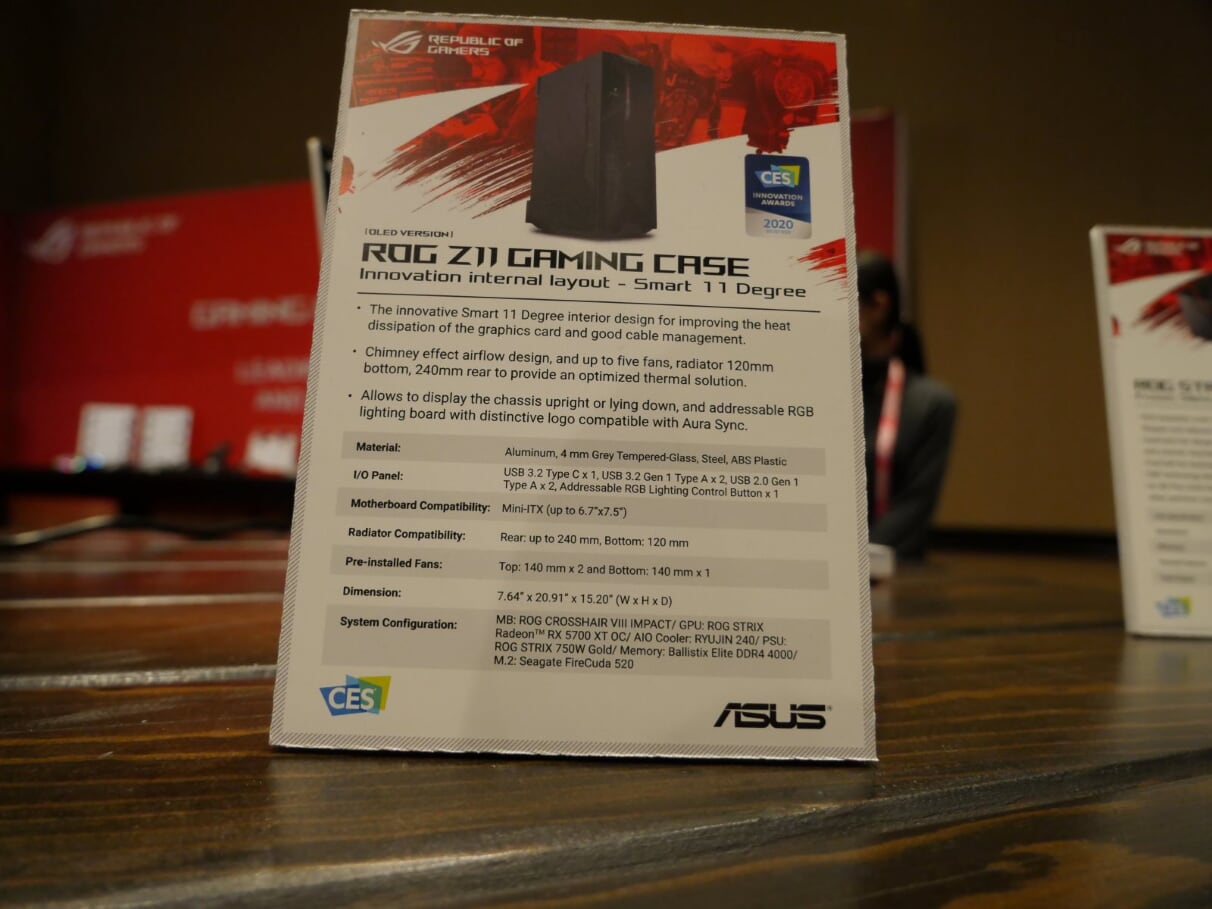 Die Front und die Seite des Gehäuses bestehen zumindest zum Teil aus verdunkeltem Hartglas, wobei die RGB-Beleuchtung wie inzwischen üblich konfigurierbar sein soll. In der Front ist ein OLED-Display verbaut, welches während der Präsentation die CPU-Temperatur anzeigte, vermutlich aber ebenfalls konfigurierbar sein dürfte. Frontseitig sind insgesamt fünf USB-Ports und ein Schalter zur Steuerung der RGB-Beleuchtung verbaut.