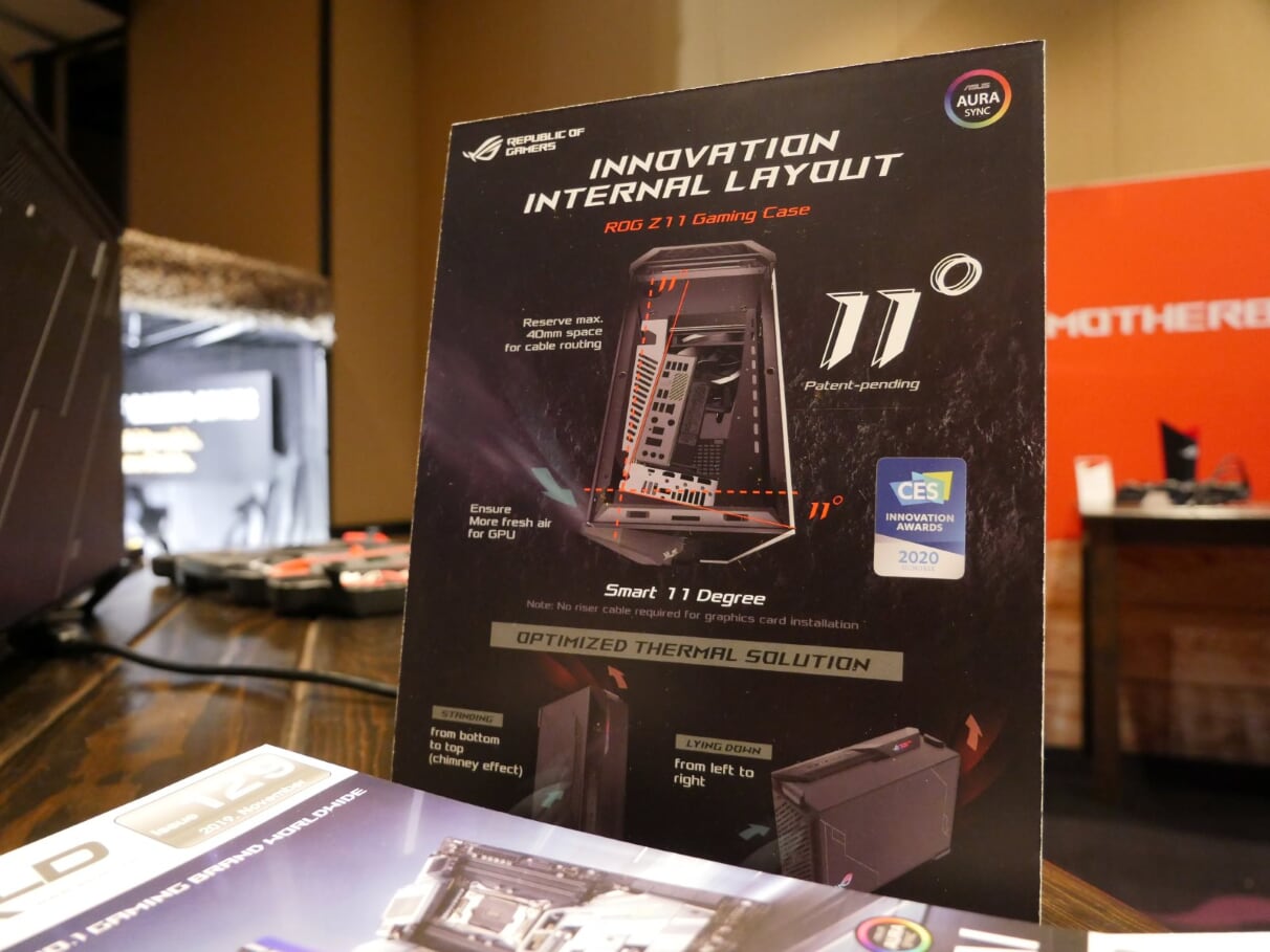 Das 19,4 x 53,14 x 38,61 Zentimeter große ROG Z11 Gaming Case setzt auf einen ungewöhnlichen Aufbau: So sind die Komponenten in einem Winkel von 11° gekippt zum Lot im Gehäuse untergebraucht, was die Belüftung verbessern soll.