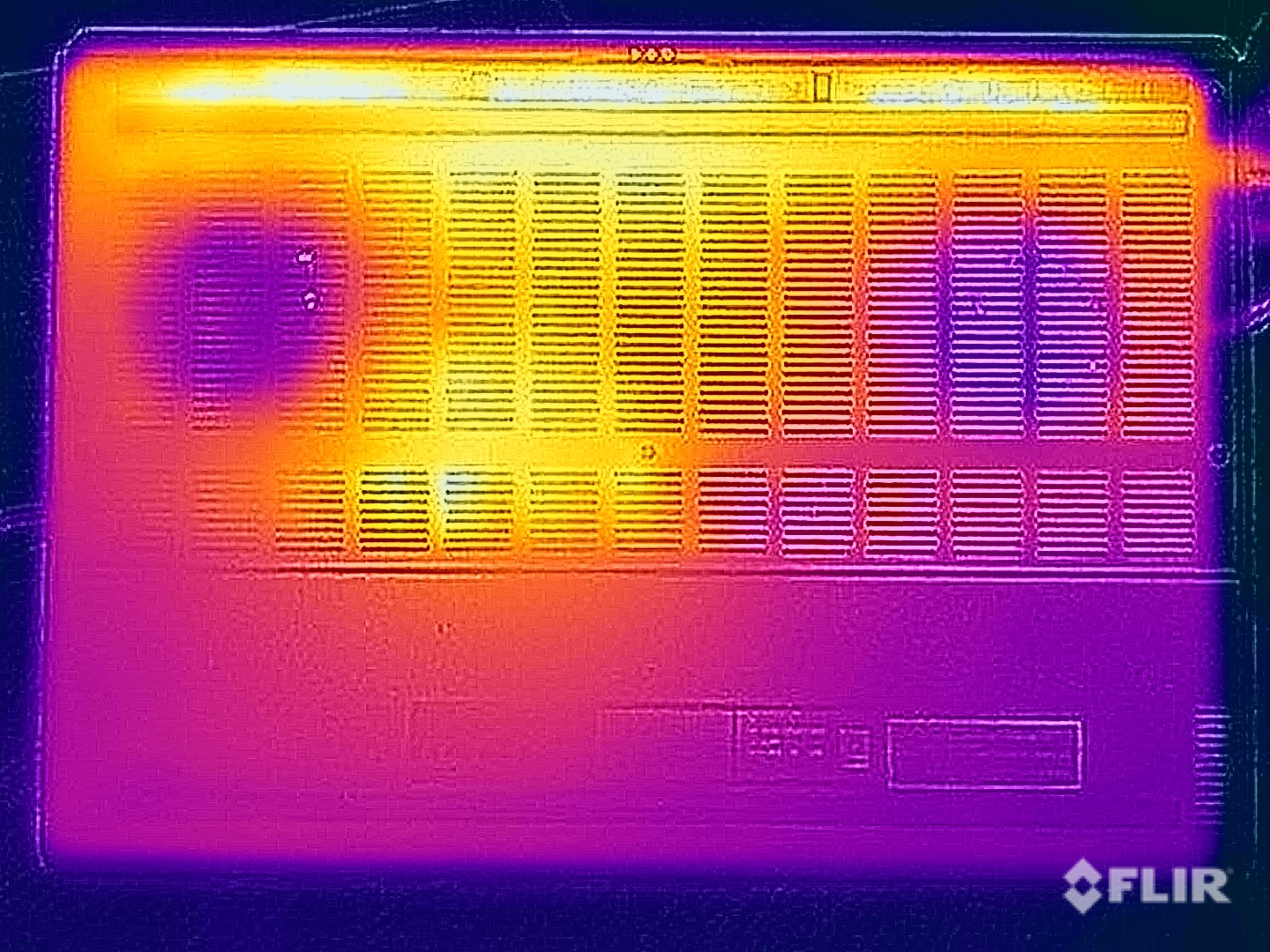 Bei den Oberflächentemperaturen gibt es keine Überraschungen. Im Leerlauf und bei wenig Last bleibt das Gehäuse angenehm kühl, unter Last messen wir aber stellenweise mehr als 50 °C. Vor allem der Bereich um die beiden Lüfter ist aber sehr kühl, weshalb auch der WASD-Bereich der Tastatur beim Spielen sehr kühl bleibt. Im Stresstest pendelt sich der Prozessor nach einigen Minuten bei 30 Watt und die Grafikkarte bei 65 Watt ein.