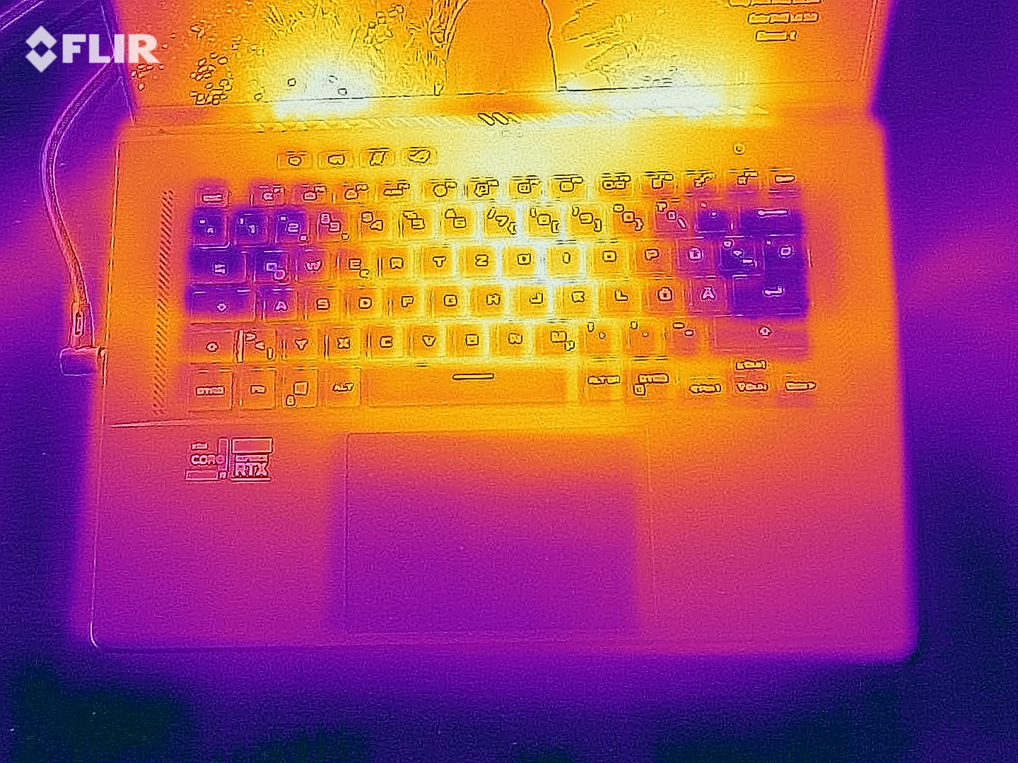 Die Oberflächen des Zephyrus M16 erwärmen sich auf bis zu 53 °C unter Last. Der wärmste Punkt liegt dabei an der hinteren rechten Ecke der Unterseite. Die Handballenauflagen sind mit bis zu 39 °C ebenfalls spürbar warm, das Gaming-Notebook von Asus lässt sich aber dennoch weiter benutzen.