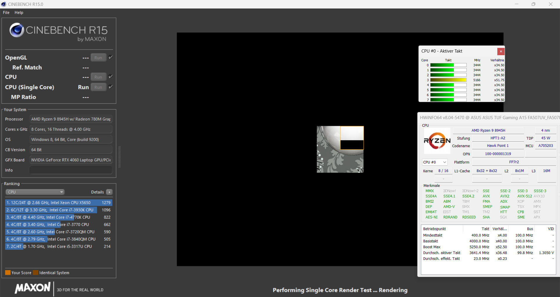 Ryzen 9 8945H (Hawk Point, Zen 4) bietet acht CPU-Kerne mit insgesamt 16 Threads bei einem Maximaltakt von 5,25 GHz (ein Kern). Dauerhafte Multi-Thread-Last (CB15 Loop) quittiert die CPU mit einem konstant hohen Turbo-Takt. Die CPU-Leistung variiert mit dem gewählten Energieprofil, die Unterschiede fallen recht klein aus. Die Benchmarkresultate liegen auf einer Höhe mit denen der baugleichen Ryzen-9-8945HS-APU.