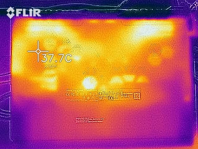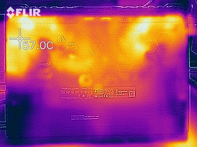 (-) Auf der Unterseite messen wir eine maximalen Wert von 55.9 °C (im Vergleich zum Durchschnitt von 43.3 °C).