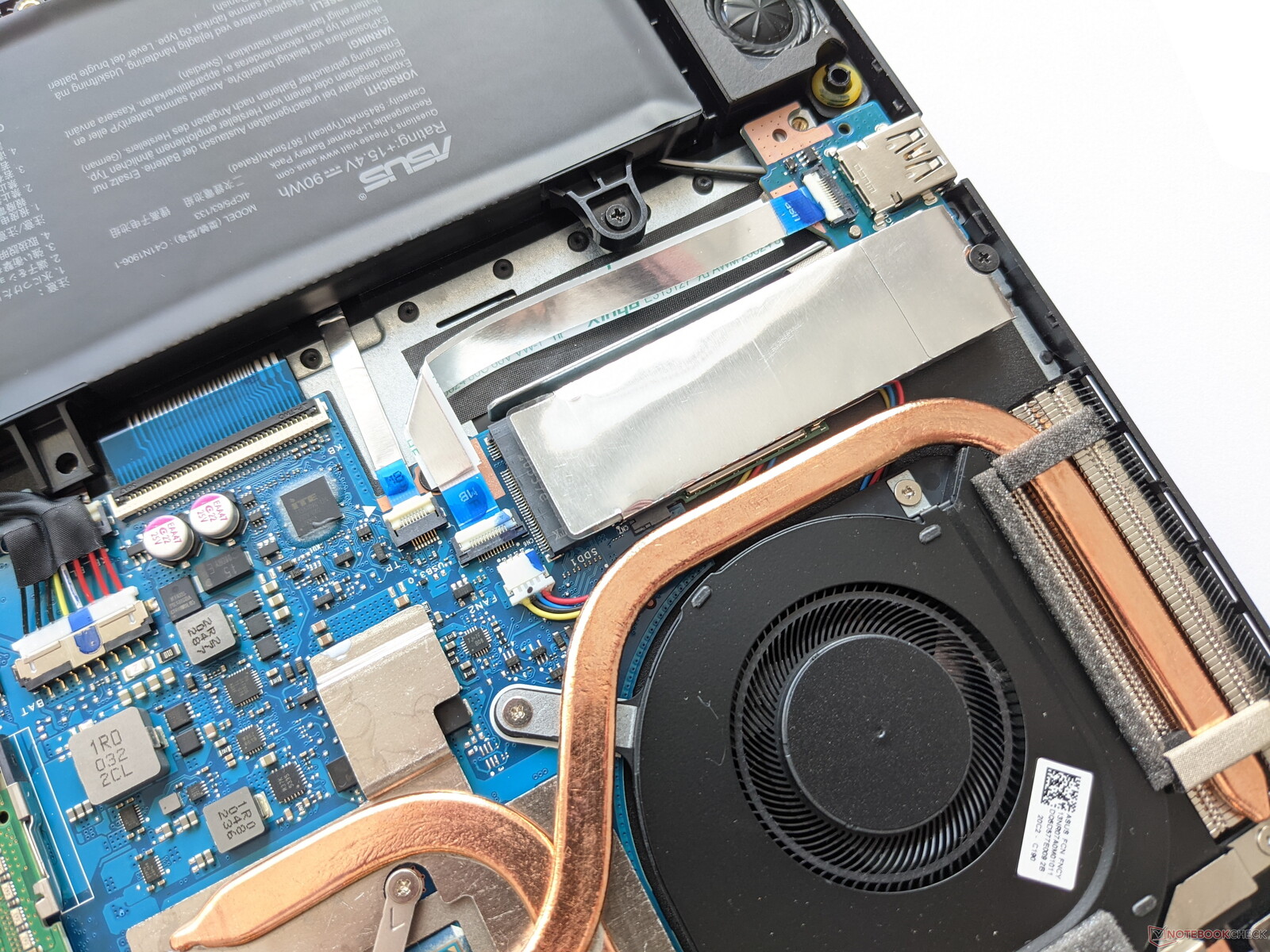 Der Boden des Asus TUF Gaming A15 lässt sich entfernen, nachdem alle Schrauben an der Unterseite gelöst wurden. Im Inneren finden sich zwei RAM- und zwei SSD-Slots, über die sich Arbeits- und Massenspeicher erweitern bzw. austauschen lassen. Auch das WLAN-Modul unterhalb der primären SSD ist auf diesem Weg zu erreichen.