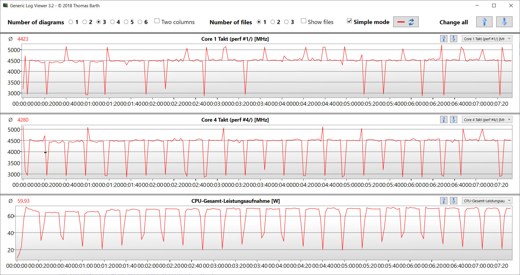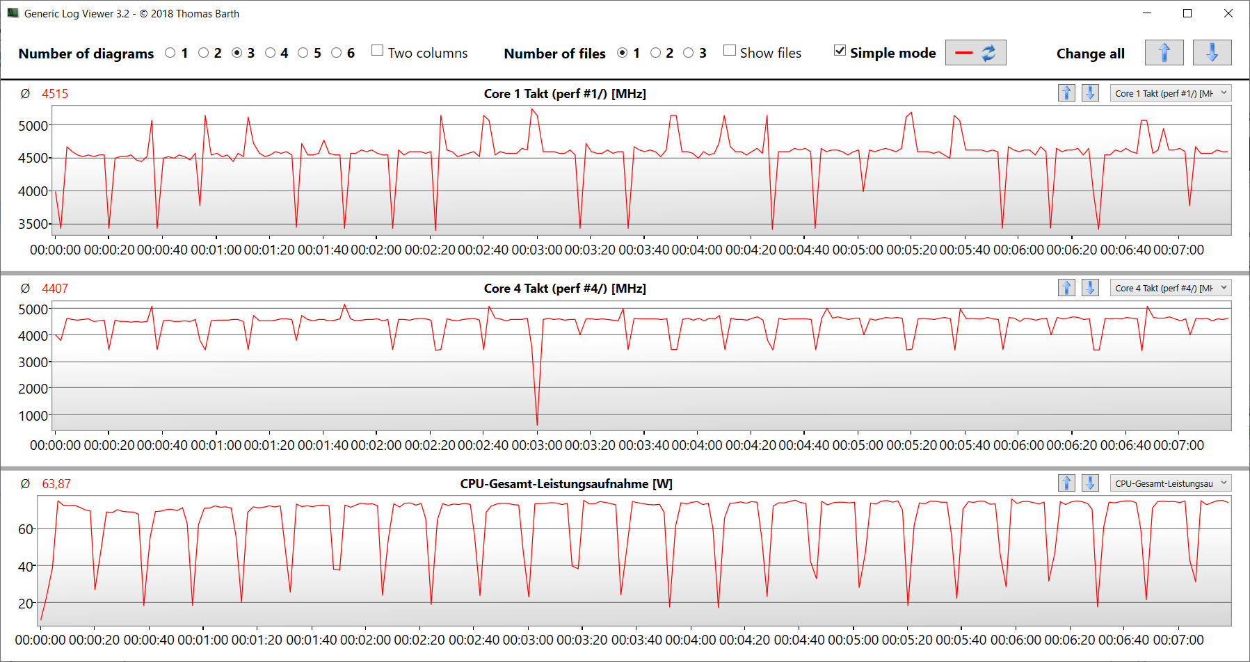 Der CB15-Schleifentest zeigt: Dauerhafte Multi-Thread-Last quittiert die CPU mit einem konstanten Turbo-Takt auf hohem Niveau - unabhängig vom gewählten Leistungsprofil.