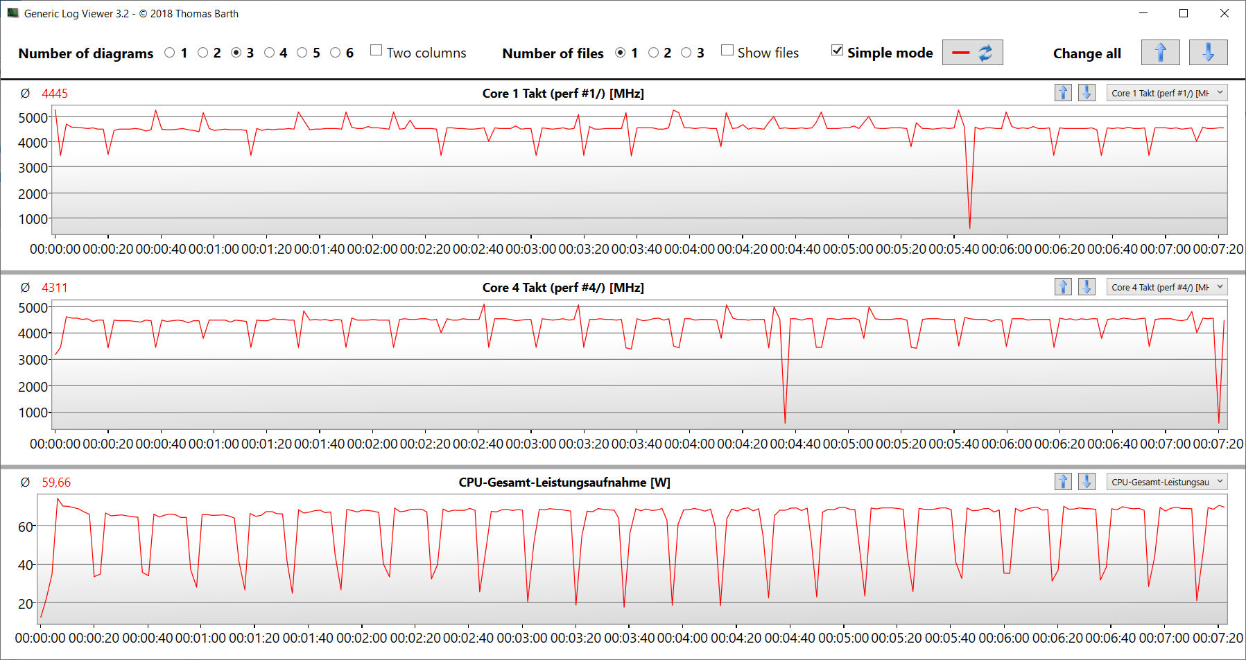 Der Stresstest (Prime95 und Furmark im Dauerbetrieb) stellt ein Extremszenario zur Überprüfung der Systemstabilität unter Volllast dar. CPU (3,4 bis 3,5 GHz) und GPU (~ 1.500 MHz) durchlaufen den Test mit Taktraten unterhalb des jeweiligen Basistakts.