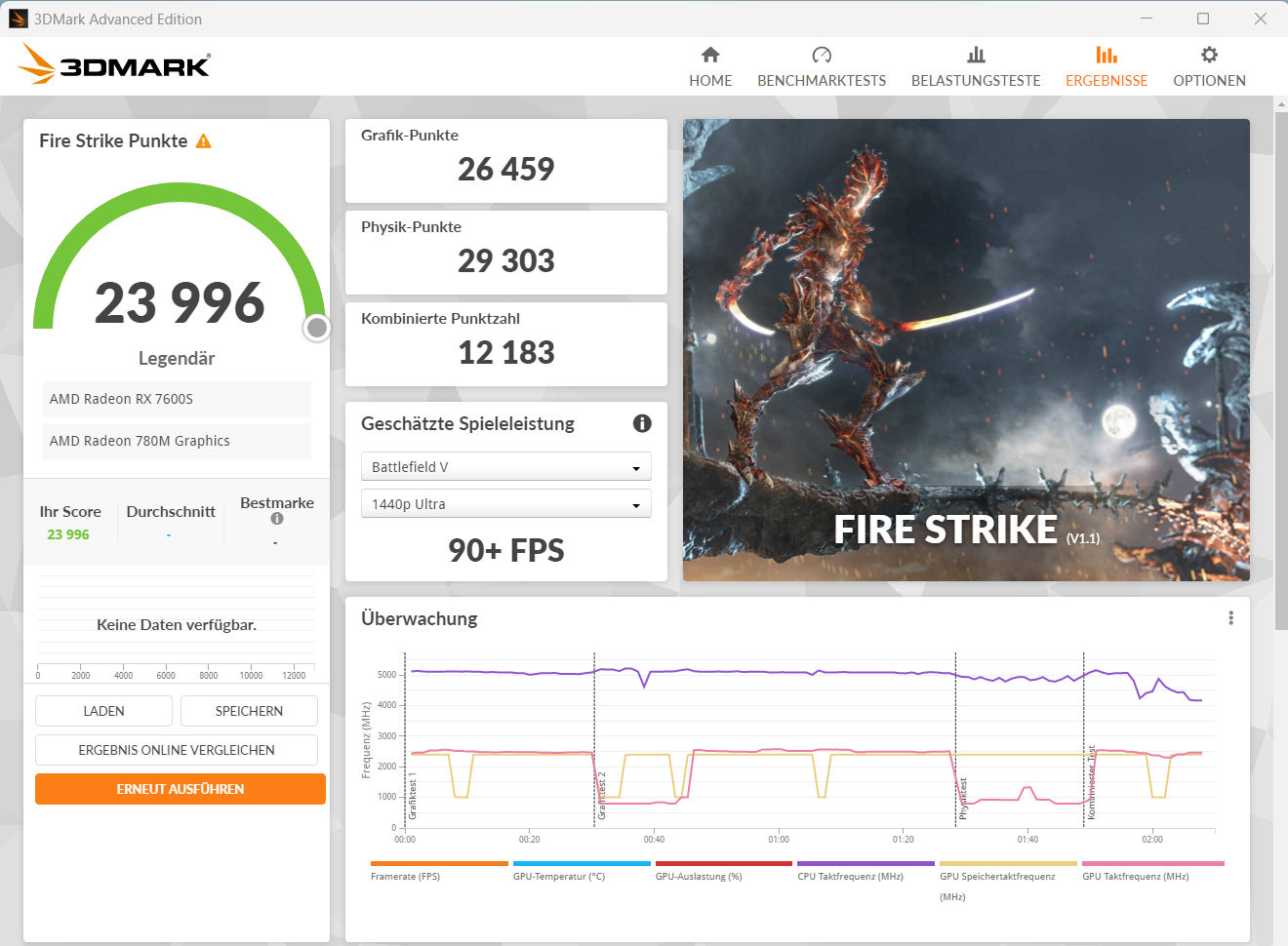 | Asus TUF Gaming A16 FA617XS R9 7940HS, Radeon RX 7600S | Lenovo Legion Pro 5 16IRX8 i7-13700HX, GeForce RTX 4060 Laptop GPU | MSI Katana 15 B12VEK i7-12650H, GeForce RTX 4050 Laptop GPU | Medion Erazer Defender P40 i7-13700HX, GeForce RTX 4060 Laptop GPU | Gigabyte G5 KE i5-12500H, GeForce RTX 3060 Laptop GPU | Asus TUF Gaming A16 FA617 R7 7735HS, Radeon RX 7600S | Durchschnittliche AMD Radeon RX 7600S | Durchschnitt der Klasse Gaming | |