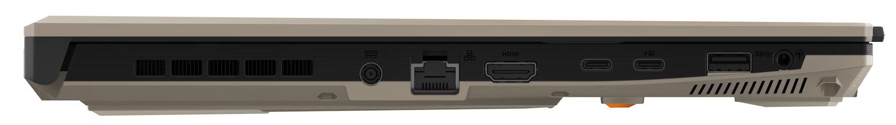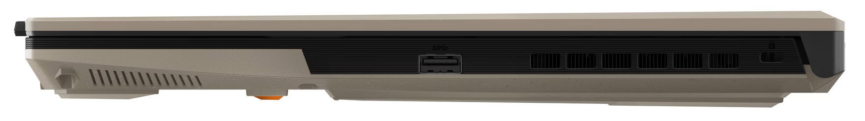 Statt des vom Schwestermodell bekannten schwarzen Gehäuses kommt beim aktuellen Testgerät ein zweifarbiges Chassis zum Einsatz. Deckelrückseite und Unterschale sind dabei in einem sandfarbenen Ton ("Sandstorm") gehalten. Auch bei den Anschlüssen hat sich etwas getan: Einer der zwei USB-C-Ports wurde auf den USB-4-Standard angehoben.