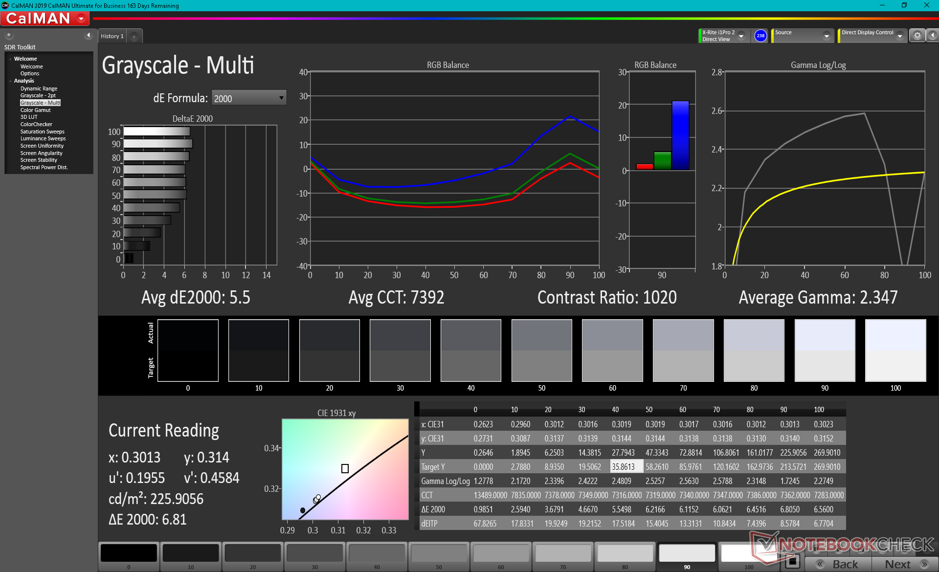 Die X-Rite-Colorimeter-Messungen zeigen ein kalibrierungsbedürftiges Display, da die Laptops der TUF-Serie ab Werk nicht vorkalibriert sind. Die Farbtemperatur ist zu kühl, besonders Blau wird viel ungenauer als andere Farben dargestellt. Nachdem wir das Panel selbst kalibriert haben, verbesserten sich Graustufen und RGB-Balance dramatisch von einem durchschnittlichen DeltaE von 5,5 auf nur noch 1,0. Allerdings sind die Farben bei höheren Sättigungsstufen aufgrund des oben erwähnten begrenzten Farbraums immer noch relativ ungenau.