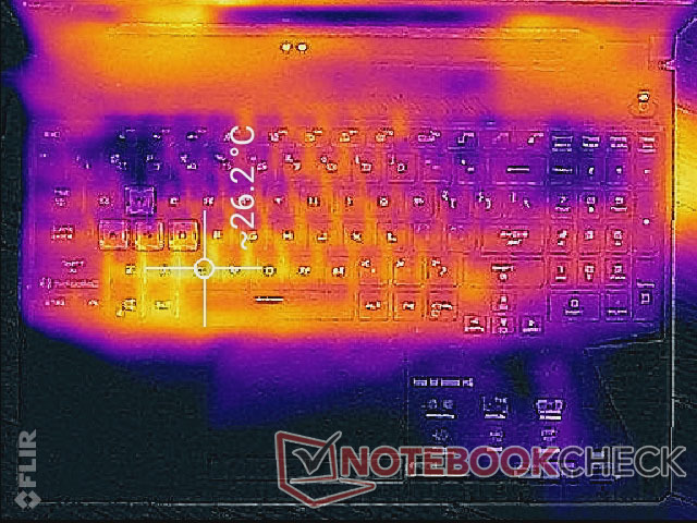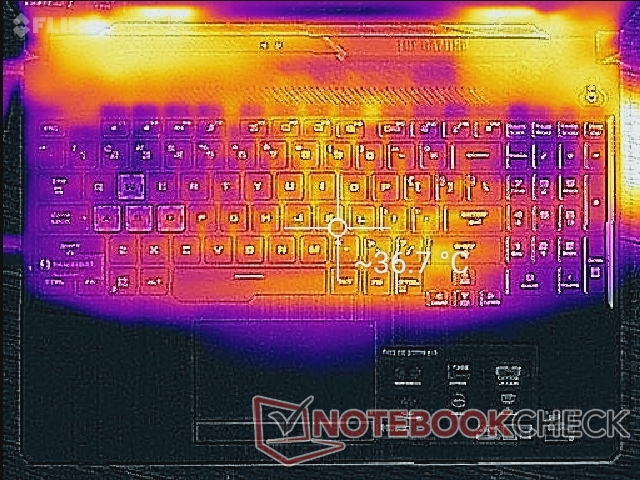 Die Oberflächentemperaturen sind am wärmsten in der Mitte und im hinteren Bereich der Tastatur, wo sie bei extremer Belastung bis zu 45 °C betragen können. Ähnliche Temperaturbereiche beobachteten wir beim MSI GF65 oder dem Razer Blade 15 Base Model. Die WASD- und NumPad-Tasten bleiben beim Gaming relativ kühl, da die beiden internen Lüfter über diese Tasten Frischluft ansaugen. Im Vergleich zum TUF Dash F15 mit der leistungsstärkeren RTX 3070 sind die Oberflächentemperaturen hier um einige Grad Celsius kühler.