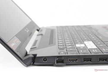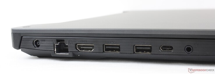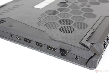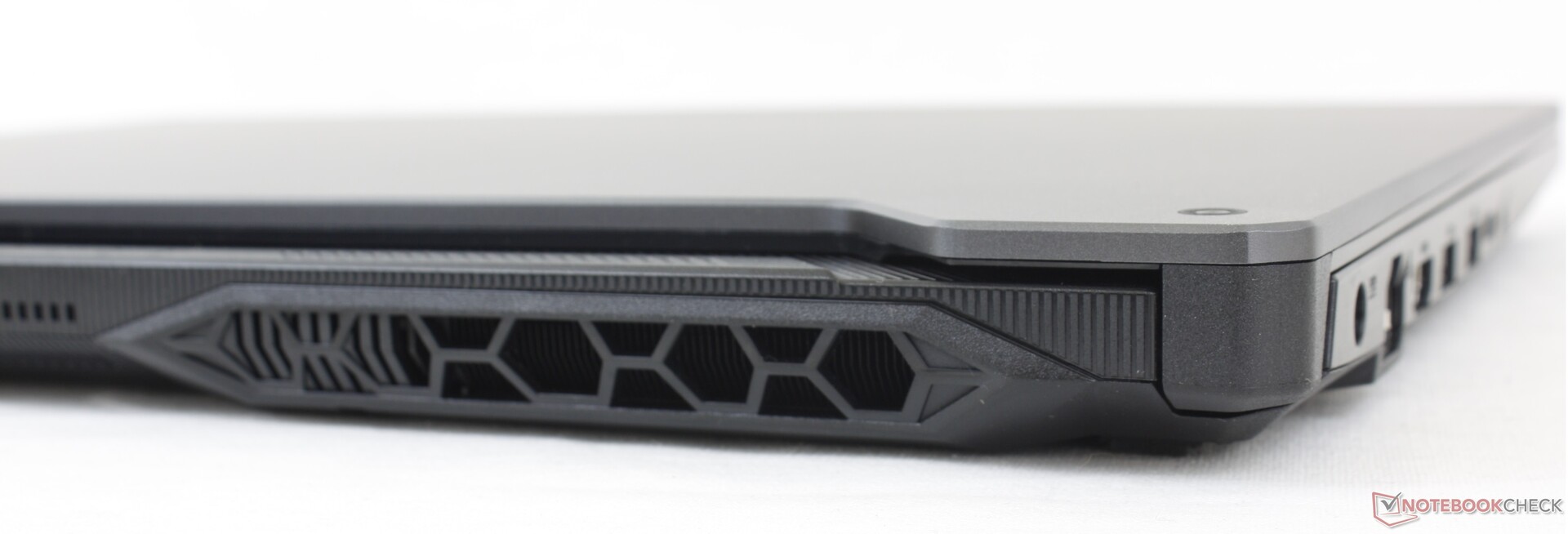 Die Anschlussoptionen sind die gleichen wie beim TUF Dash F15, aber neu angeordnet und mit einigen bemerkenswerten Upgrades. Die rechte Kante beherbergt zum Beispiel nur noch einen USB-Anschluss statt zwei. Der USB-C-Anschluss an der linken Kante unterstützt nun vollständig Thunderbolt 4, während dies bei früheren TUF-Notebooks mit AMD- oder Intel-CPUs der 10. Generation oder älter nicht der Fall war.