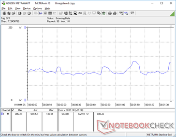 Mit dem mittelgroßen (~15,1 x 7,2 x 2,3 cm) 180-Watt-Netzteil können wir einen maximalen Verbrauch von 173,5 W aufzeichnen. Dieser Wert ist nur temporär, da er nach ein paar Minuten auf nur 135 W sinkt, wie der untenstehende Screenshot zeigt. Auch unter solch hoher Last verlangsamt sich die Ladegeschwindigkeit, aber sie entlädt sich glücklicherweise nie, anders als bei älteren XPS-17-Modellen.