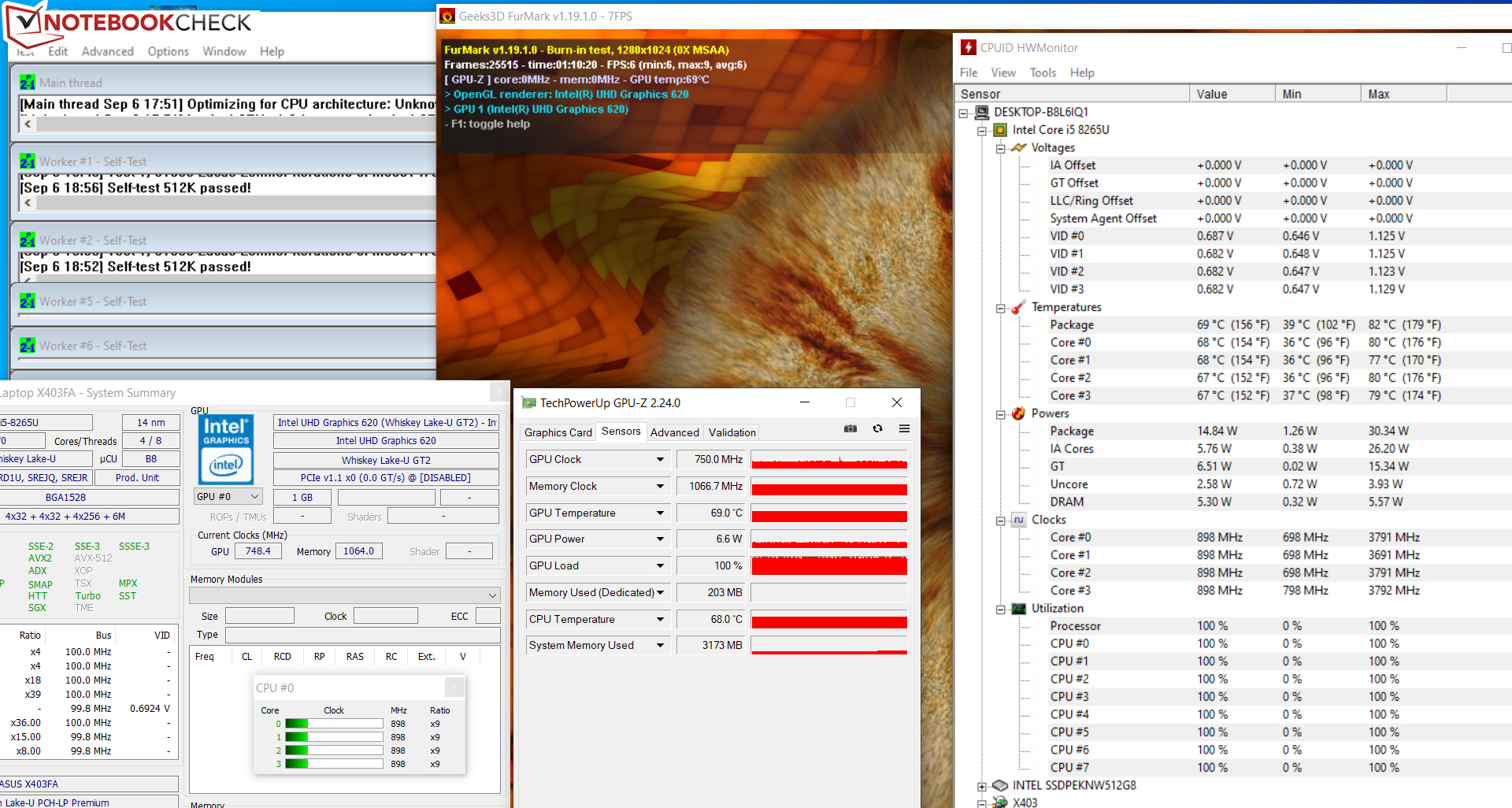 Unseren Stresstest (Prime95 und Furmark laufen für mindestens eine Stunde) durchläuft das Asus Notebook im Netz- und im Akkubetrieb auf fast die gleiche Weise. In den ersten zwei Minuten arbeitet die CPU mit Geschwindigkeiten zwischen 2,5 und 2,6 GHz (Netzbetrieb) bzw. 1,8 bis 2,2 GHz (Akkubetrieb). Dann sinkt der Takt auf 1,1 bis 1,2 GHz, später auf 900 bis 1.000 MHz und verbleibt auf diesem Niveau. Der Takt des Grafikkerns sinkt von anfänglich 900 bis 950 MHz auf 700 bis 750 MHz. Der Stresstest stellt ein Extremszenario dar, welches so im Alltag nicht auftritt. Wir überprüfen mit diesem Test, ob das System auch bei voller Auslastung stabil läuft.