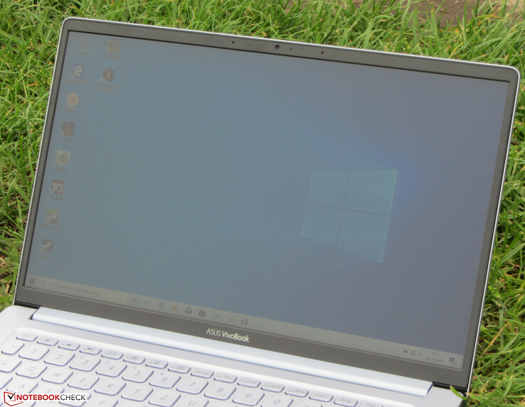 Asus stattet das Vivobook mit einem blickwinkelstabilen IPS-Panel aus. Somit kann der Bildschirm aus jeder Position heraus abgelesen werden. Die Leuchtstärke des Bildschirms ist auf die Nutzung innerhalb von Gebäuden ausgelegt. Im Freien wird es schwierig. Hier kann der Bildschirm allenfalls bei bewölktem Himmel oder im Schatten abgelesen werden.