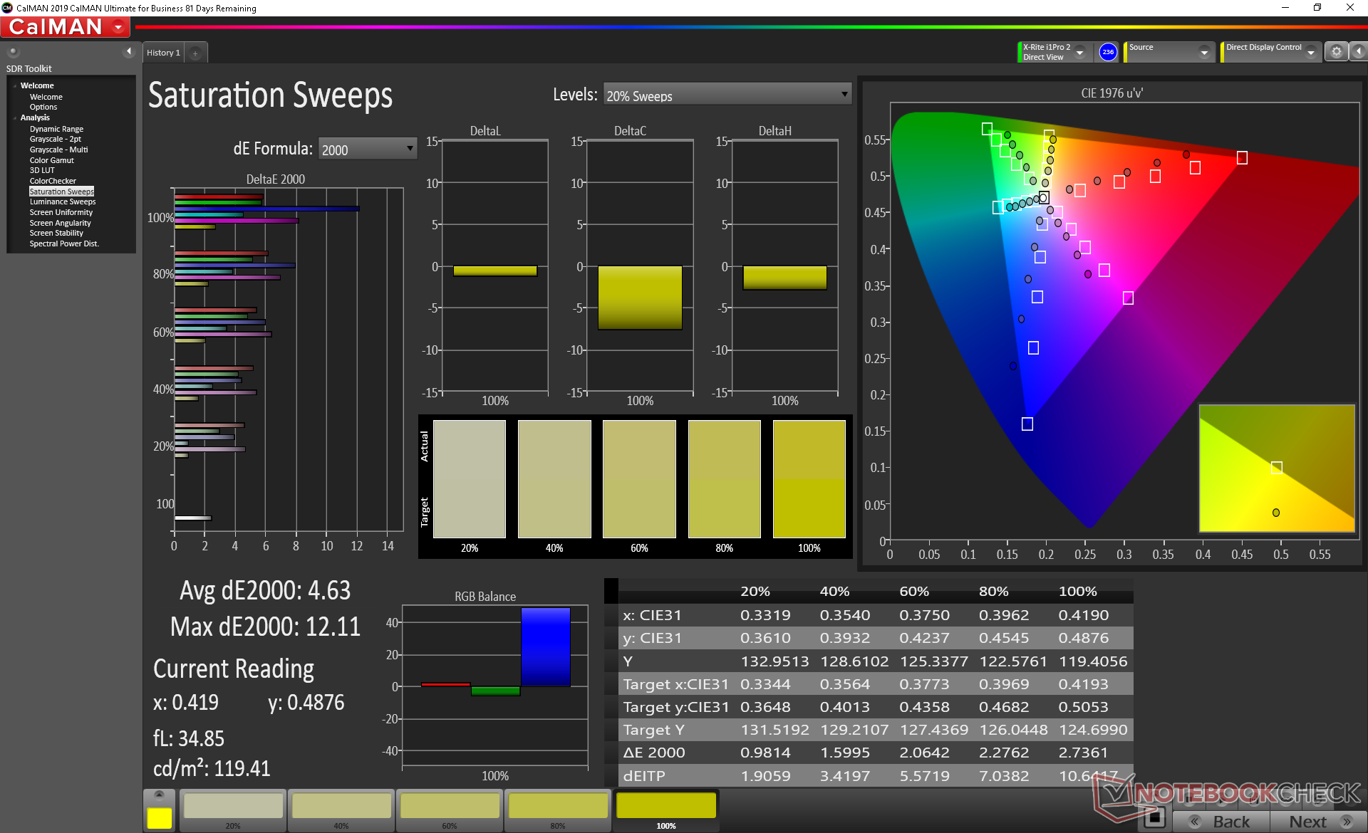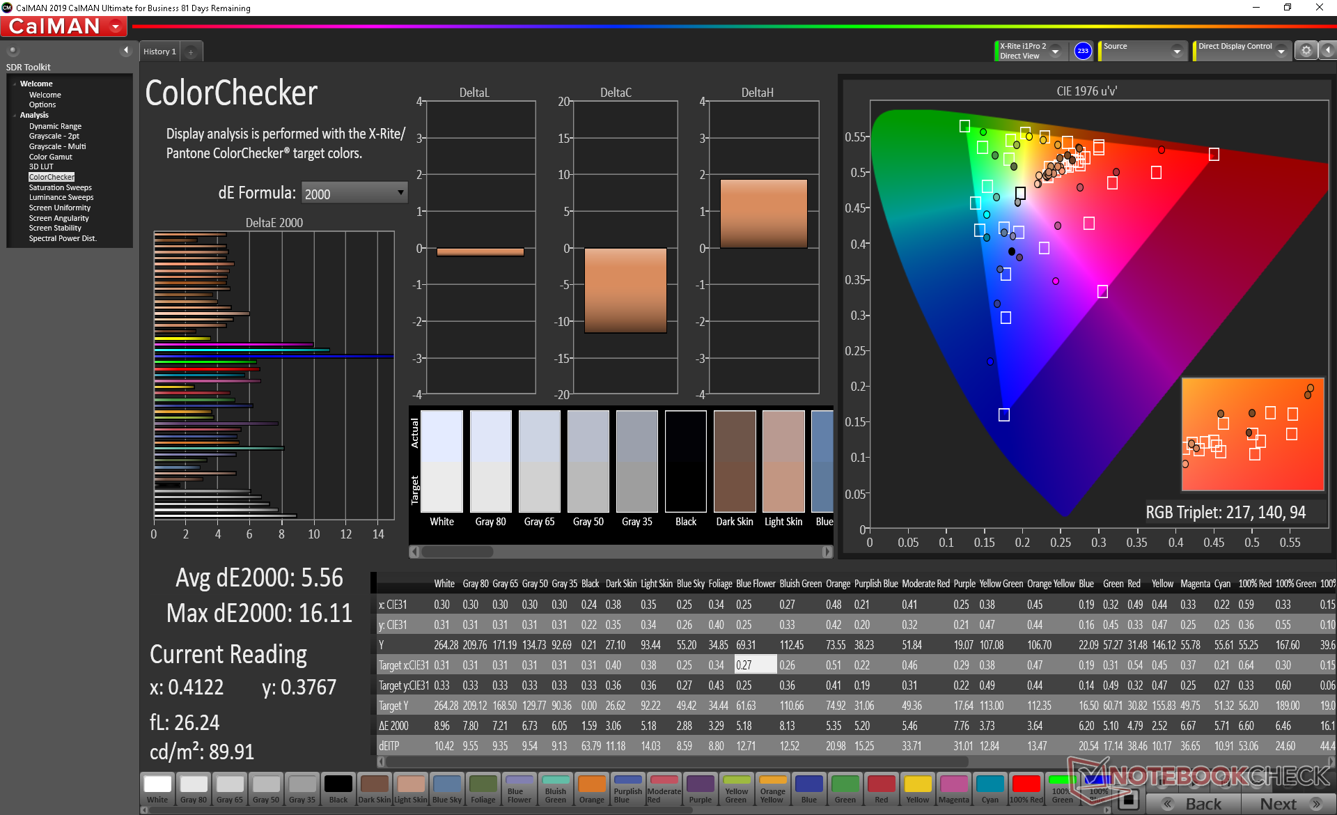 Die Anzeige ist im Lieferzustand mit einer zu kühlen Farbtemperatur und einem relativ hohen Graustufen-DeltaE-Wert von 5,8 nicht gut kalibriert. Wir konnten die Werte durch eigene Kalibrierung deutlich verbessern, doch wurden die Farben aufgrund des oben erwähnten begrenzten Farbraumes mit größeren Sättigungen zunehmend ungenau.