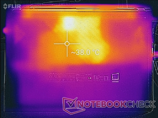 Die Oberflächentemperaturen sind selbst im Leerlauf auf dem Desktop recht warm, wobei die Hot Spots oben und unten über 32 °C bzw. 38 °C erreichen. Dieselben Stellen können an der Unterseite bis zu 44 °C bis sogar 70 °C warm werden, da die Heatpipes die Bodenplatte berühren. Diese Bereiche befinden sich glücklicherweise auf der Rückseite des Chassis und weg von den Handballenauflagen. Trotzdem empfehlen wir bei solch extremen Belastungen die Verwendung eines flachen Schreibtisches.