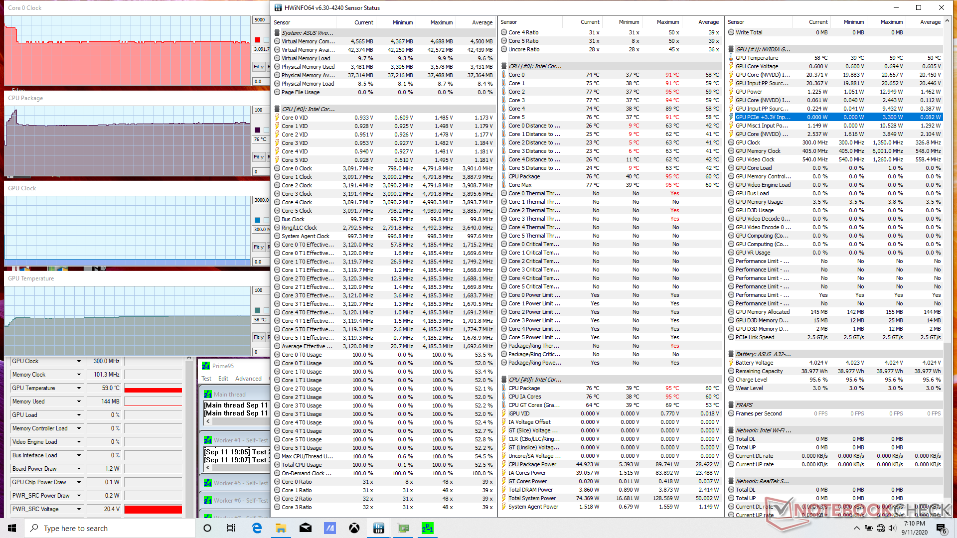 Bei der Ausführung von Prime95 stiegen die CPU-Taktraten auf 4,2 GHz, bis sie etwa 10 Sekunden später eine Kerntemperatur von 95 °C erreichten. Danach sanken die Taktraten in den Bereich von 3,1 bis 3,2 GHz und hielten so eine kühlere Temperatur von 76 °C. Der Alienware m15 R3 mit dem gleichen Core i7-10750H stabilisiert sich unter ähnlichen Bedingungen bei viel höheren 4,2 GHz, was unsere oben genannten unterdurchschnittlichen CineBench-Ergebnisse für den Asus erklärt.