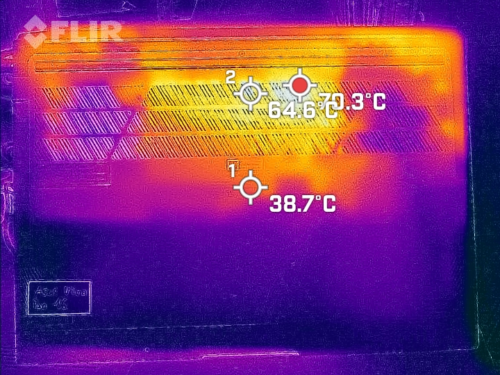 (-) Auf der Unterseite messen wir eine maximalen Wert von 53 °C (im Vergleich zum Durchschnitt von 39.2 °C).