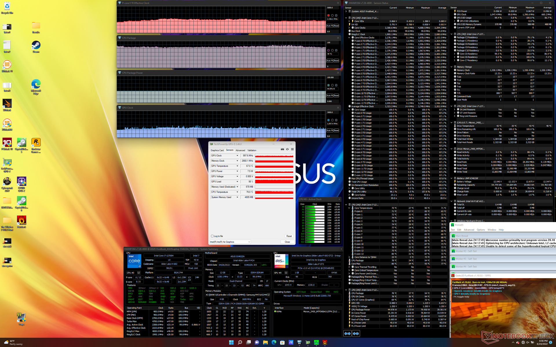 Wenn die CPU unter Prime95 belastet wird, steigen die Taktraten für einige Sekunden auf 4 GHz, bevor sie schnell eine Kerntemperatur von 94 °C erreichen. Danach sinken Leistung und Temperatur kontinuierlich auf 3 GHz bzw. 84 °C, bevor sie schließlich noch weiter auf 1,3 bis 2,3 GHz gedrosselt werden, wie im Screenshot unten gezeigt. Die Leistung des CPU-Gehäuses lag zu Beginn des Tests bei bis zu 80 W und schwankte dann aufgrund von thermischen Einschränkungen zwischen 27 W und 49 W. Die Temperaturen können über 90 °C erreichen, deutlich wärmer als bei Modellen wie dem HP Envy 14 oder Razer Blade Stealth unter ähnlichen Bedingungen. Dies ist wahrscheinlich die Folge davon, dass Asus hier eine Core H-Serie CPU in ein Ultrabook-Gehäuse gepackt hat.