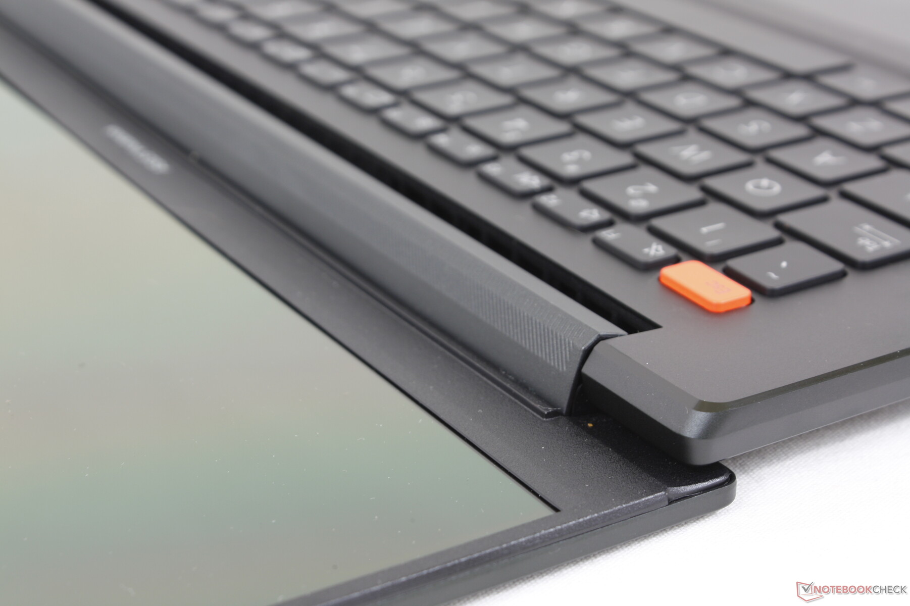 Der schwächste Teil des Vivobook-Gehäuses ist das Display. Es ist zwar glänzend, hat aber kein Glasumrandung, die sonst typischerweise sowohl den Bildschirm als auch den Deckel verstärkt. Im Vergleich zu den steiferen Deckeln des Zenbook Flip 14, HP Spectre x360 14, oder Dell XPS 13 – die alle über eine Glasverstärkung von Kante zu Kante verfügen – lässt sich der Deckel unseres Vivobooks also leichter verdrehen und biegen. Die Basis des Laptops ist jedoch stabiler und viel widerstandsfähiger gegen Verformungen als der Deckel. Wir haben ähnliche Eigenschaften beim 16-Zoll Vivobook Pro 16X gesehen, das einem sehr ähnlichen Designansatz wie das Vivobook S 14X folgt.