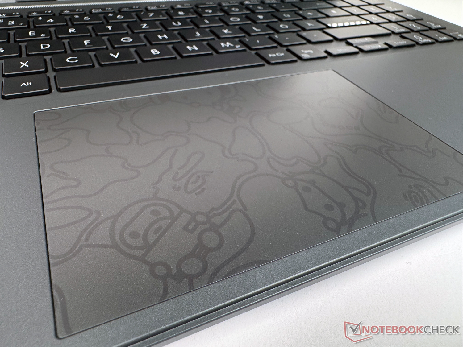 Die Zusammenarbeit mit dem Streetwear-Label "A Bathing Ape" (kurz BAPE) zieht sich auch im aufgeklappten Zustand weiter durch. Selbst das Touchpad ist mit den gleichen Motiven bedruckt. Zudem grüßt der putzige Affe aus der Geräteecke und auf der Unterseite. Farblich präsentiert sich das Gerät in Schwarz. Wer sich für die schwächere Ausstattung basierend auf dem Intel Core i5-13500H entscheidet, bekommt das BAPE-Modell in Silber.