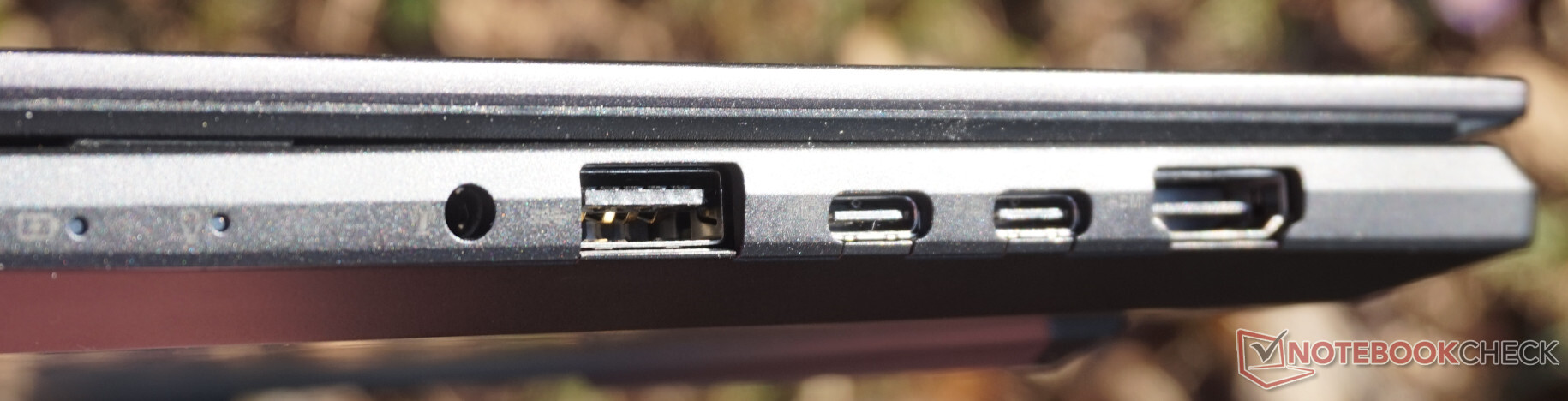 Rechts gibt es die mittlerweile gängige Bestückung mit zwei nebeneinander liegenden USB-C-Anschlüssen, sodass zumindest einer davon beim Laden weiterhin verwendet werden kann. Beide beherrschen neben der Stromversorgung auch die Übertragung von Videosignalen per DisplayPort. Wirklich schnell sind sie aber nicht. Gerade einmal 10 Gbit/s sind erreichbar, was beim Anschluss einer externen SSD ein paar Limitierungen mit sich bringt. Die Leistungsfähigkeit beim Zugreifen auf die Daten sollte hingegen nicht beeinträchtigt sein.