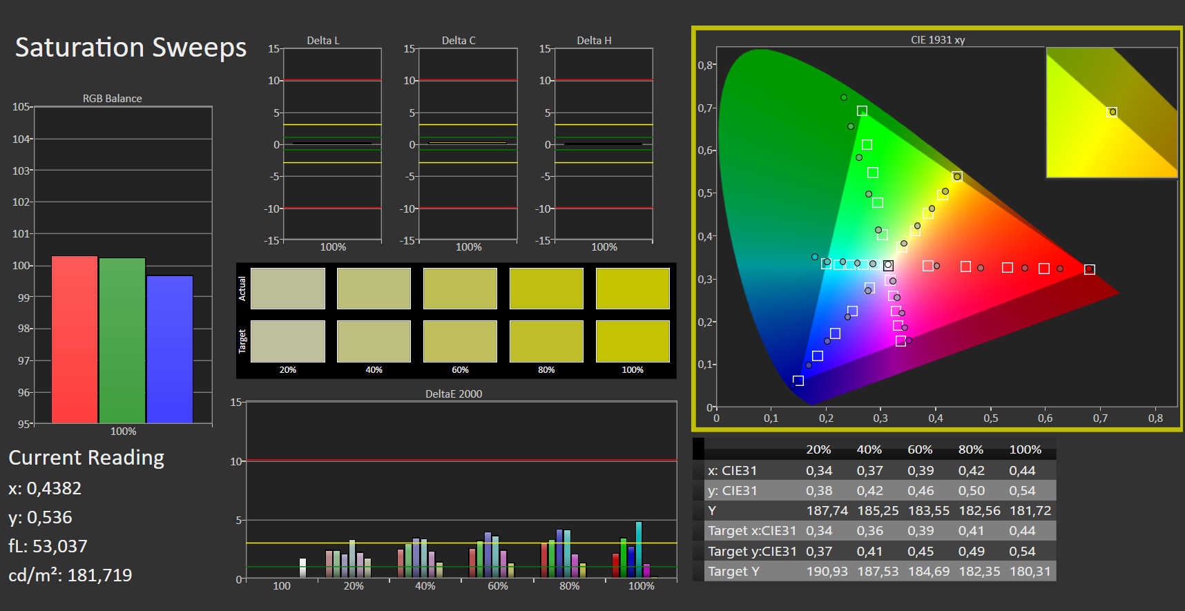 | Delta E Graustufen * | 1.43 | 1.4 2% | 2.5 -75% | 2.68 -87% | 1.4 2% | 4 -180% |