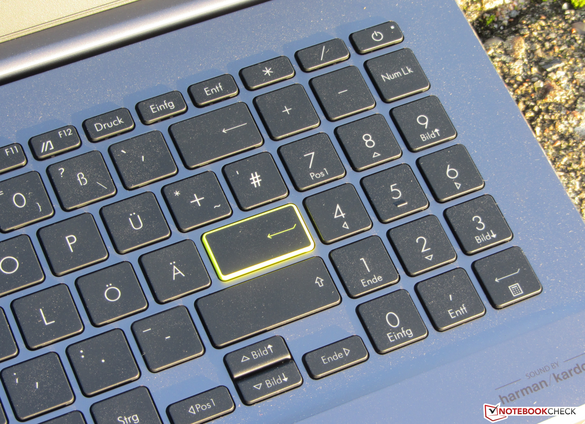 Die ebenen, glatten Tasten der beleuchteten Chiclet-Tastatur bieten einen kurzen Hub und einen klaren Druckpunkt. Während des Tippens gibt die Tastatur minimal nach. Als störend hat es sich nicht erwiesen. Alles in allem liefert Asus hier eine alltagstaugliche Tastatur. Die glatte Oberfläche des multitouchfähigen Clickpads (10,5 x 7,3 cm) macht den Fingern das Gleiten leicht. Es reagiert auch in den Ecken auf Eingaben. Das Pad verfügt über einen kurzen Hub und einen deutlichen Druckpunkt.
