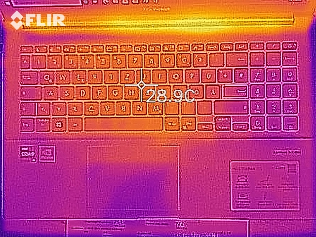 Sonderlich stark erwärmt sich der Asus Computer nicht. Während des Stresstests bzw. des Witcher-3-Tests registrieren wir an zwei bzw. drei Messpunkten Temperaturen knapp oberhalb von 40 Grad Celsius. Im Alltagsbetrieb liegen die Werte im grünen Bereich.