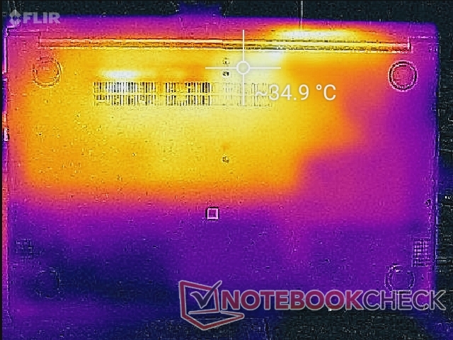 Die rechte Seite des Laptops erhitzt sich durch das Design des Kühlsystems stets stärker als die linke Seite. Die Hot Spots an der Tastatur erreichen 42 °C beim Gaming, was mit dem HP Pavilion 15 mit Iris Xe vergleichbar ist. Allerdings wird die Unterseite im hinteren Bereich mit beinahe 50 °C nochmals heißer.