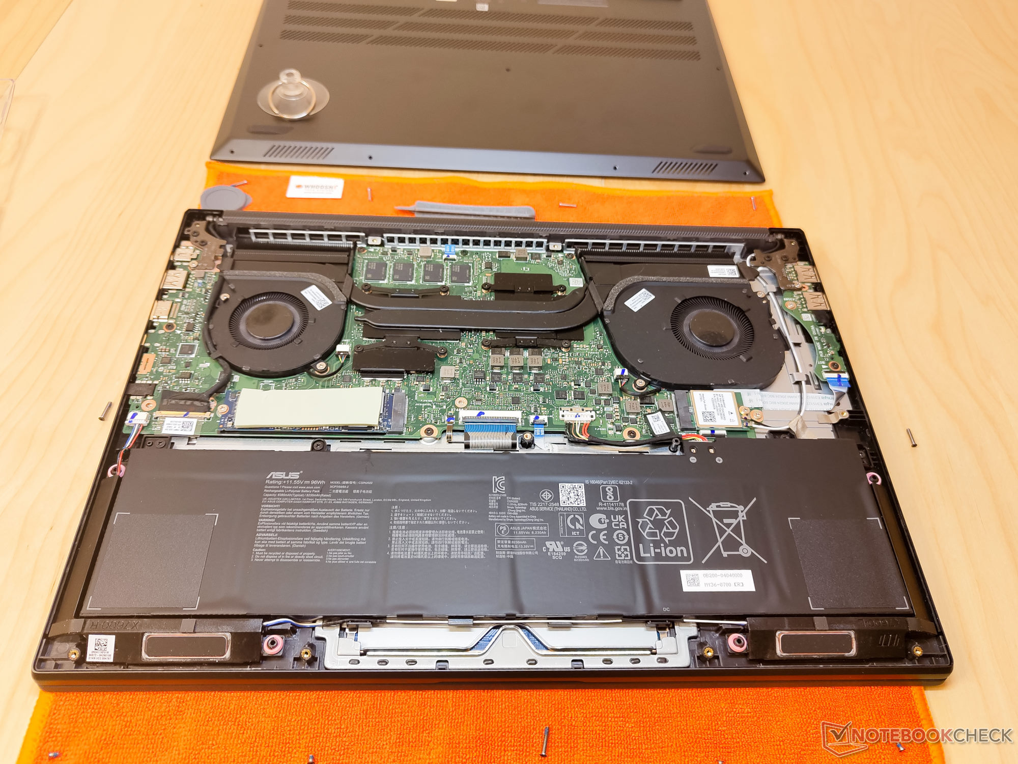Gleich 11 TX5-Schrauben sichern die Basisabdeckung. Sind diese einmal entfernt, lässt sich die Abdeckung trotzdem nicht gerade leicht abnehmen. Einen guten Saugnapf und ein Plastiköffnungswerkzeug benötigt man hier, um die Abdeckung vorsichtig zu entfernen. Der 16 GB große Arbeitsspeicher ist auf dem Mainboard verlötet und somit nicht aufrüstbar. Leicht austauschbar sind hier nur das WLAN-Modul und die M.2-SSD. Abseits davon bietet das Vivobook keine Upgrade-Möglichkeiten.