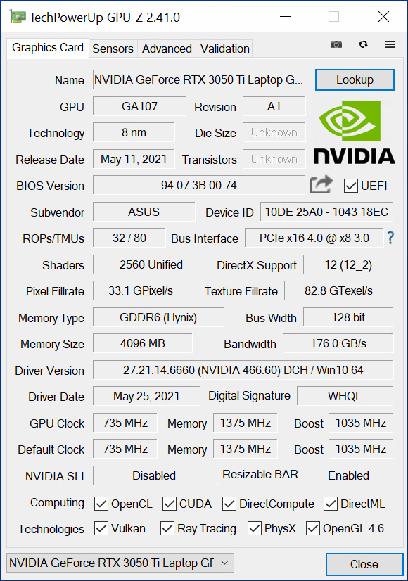 | 88.4 % v7 (old) | 08 / 2021 | Dell XPS 15 9510 11800H RTX 3050 Ti OLED i7-11800H, GeForce RTX 3050 Ti Laptop GPU | 1.9 kg | 18 mm | 15.60" | 3456x2160 |