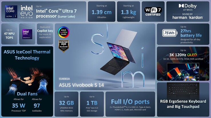 Das Asus Vivobook S 14 (S5406SA) wurde schon zur IFA im September angekündigt, endlich kann das 1,3 Kilogramm leichte, 1,39 Zentimeter dünne Ultrabook auch in Deutschland bestellt werden. Bisher ist nur eine Variante erhältlich, die mit Intel Core Ultra 7 256V, 16 GB Arbeitsspeicher und 1 TB SSD zu Preisen ab 1.341 Euro zu finden ist, unter anderem bei Computeruniverse, die unverbindliche Preisempfehlung liegt bei 1.399 Euro.