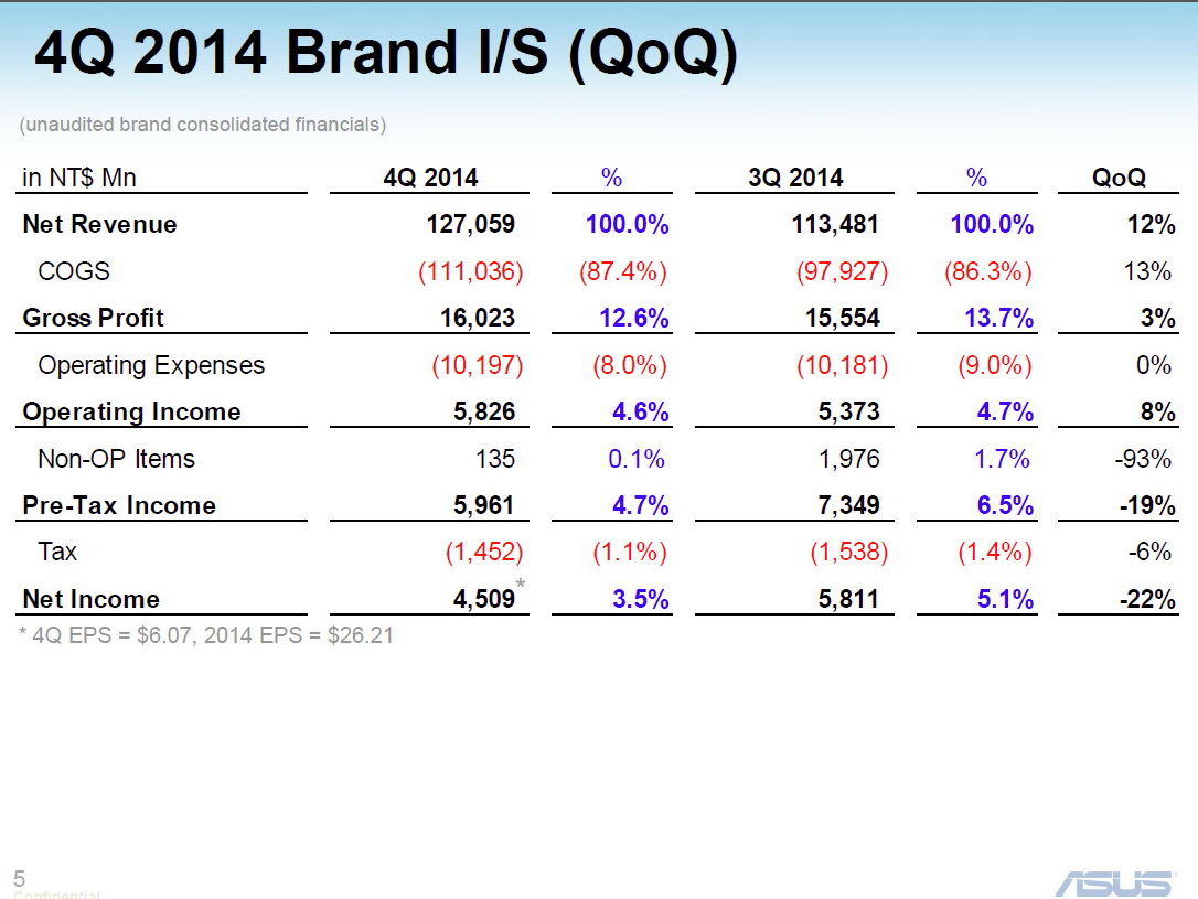 Und auch in der Quartalsbetrachtung zwischen 3. und 4. Quartal 2014 konnte Asus beim Nettogewinn nicht von einem starken Weihnachtsgeschäft 2014 profitieren. Im Vergleich zu Q3/2014 mit 5,81 Mio. Taiwan Dollar (162,39 Mio. Euro) rutschte der Gewinn im 4. Quartal 2014 auf 4,51 Mrd. (126,06 Mio. Euro) ab. Das Entspricht einem Minus von 22 Prozent. Als Hauptgrund für den rückläufigen Gewinn nannte Asus-CFO David Chang die enormen Währungsverluste im Zuge der Rubelkrise.