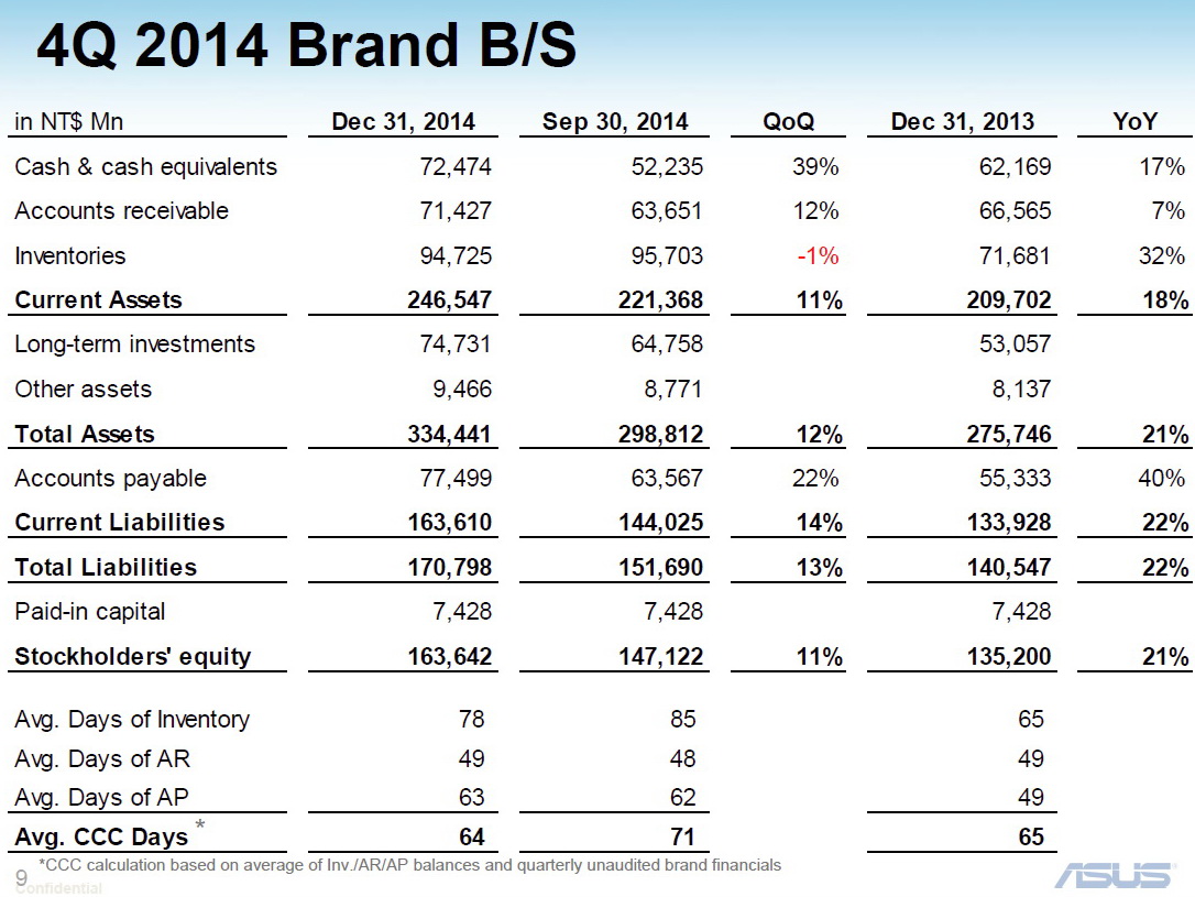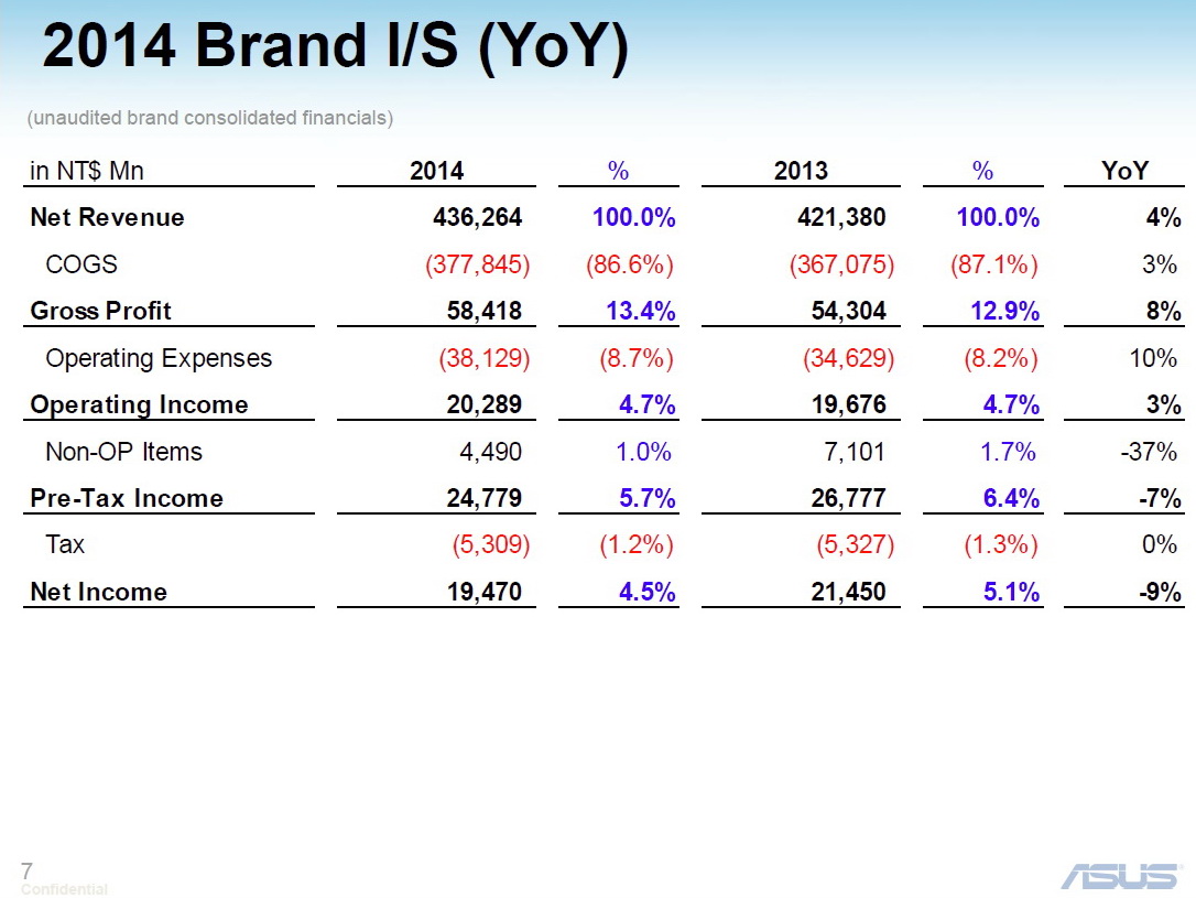 Asus erwirtschaftete, laut den heute veröffentlichten Bilanzzahlen, im vergangenen Jahr deutlich weniger Gewinn als im Jahr 2013. Zwar stieg der Jahresumsatz im Vergleich zu 2013 um 4 Prozent von 421,38 Mrd. Taiwan Dollar (11,78 Mrd. Euro) auf 436,26 Mrd. (12,19 Mrd. Euro), gleichzeitig sank der Nettogewinn allerdings um 9 Prozent, von 21,45 Milliarden Taiwan Dollar (599,55 Mio. Euro) auf 19,47 Mrd. (544,21 Mio. Euro).