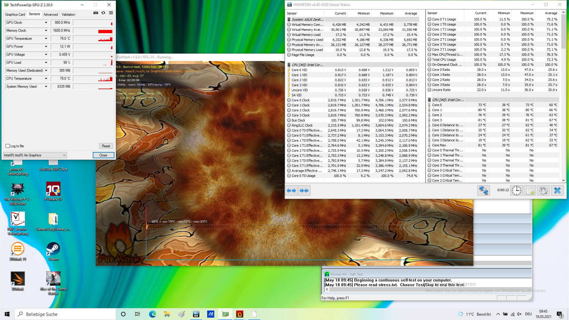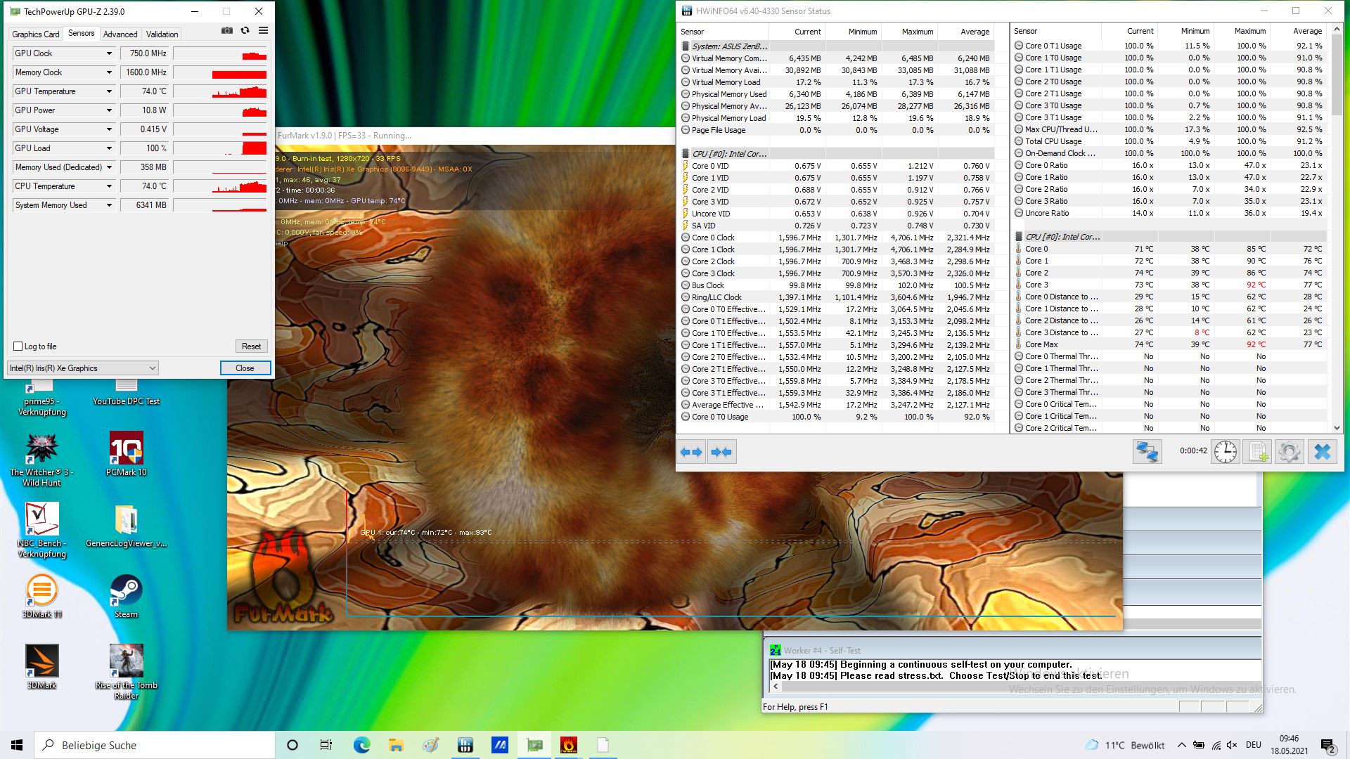 Im Stresstest mittels Prime95 und Furmark takten die Kerne kurzzeitig auf ca. 2,7 GHz hoch und unterschreiten demnach gleich zu Beginn den Basistakt von 2,8 GHz. Die thermische Drosselung setzt dann auch noch recht früh ein, bereits als eine Kerntemperatur von nur etwa 75 °C erreicht wird, sinkt der Takt in den folgenden Sekunden und Minuten graduell ab und stabilisiert sich letztlich zwischen 1,2 und 1,4 GHz und Kerntemperaturen von um die 65 °C.