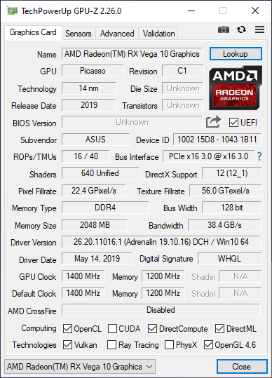 Im Asus ZenBook 14 UM431DA sorgt die integrierte Grafikeinheit AMD Radeon RX Vega 10 für die Darstellung von Bildinhalten. Diese GPU profitiert stark von verbautem Arbeitsspeicher in Dual-Channel-Konfiguration und eignet sich mit genügend RAM sogar für einfache Spiele. Mit den hier verbauten 8 GB RAM erreicht das ZenBook Benchmarkwerte, die im 3DMark 11 leicht unter und in den 3DMarks Fire-Strike und CloudGate leicht über dem Durchschnitt anderer Notebooks mit dieser GPU liegen. Mit diesem Ergebnis eignet sich das ZenBook 14 auch für einfache Bildbearbeitung.