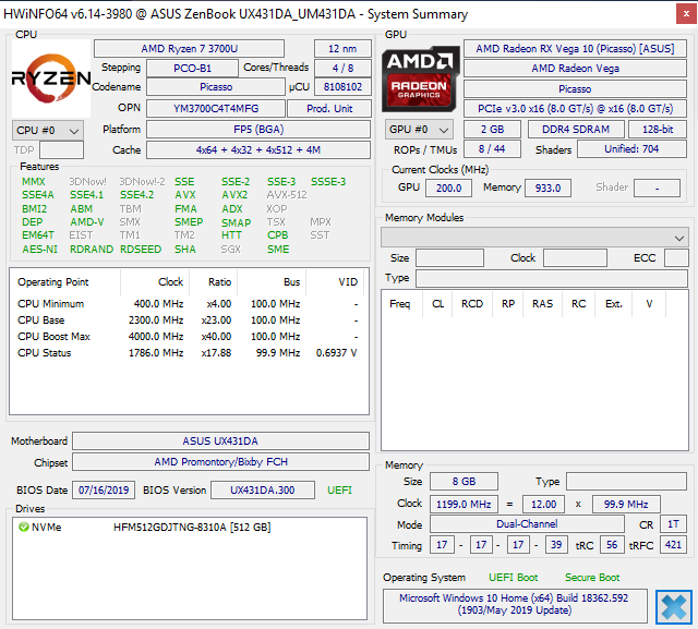 | 81.2 % v7 (old) | 02 / 2020 | Asus ZenBook 14 UM431DA-AM020T R7 3700U, Vega 10 | 1.4 kg | 16 mm | 14.00" | 1920x1080 | |