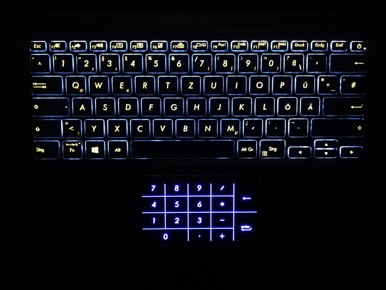 Als Mausersatz setzt Asus ein Clickpad ein, das mit seiner durchschnittlichen Größe für eine präzise Navigation des Mauszeigers geeignet ist. Sowohl linke als auch rechte Mausklicks lassen sich per Touch und auch durch Druck auf das Pad gut auslösen. In der rechten oberen Ecke befindet sich ein Symbol, über welches sich ein Nummernblock auf das Clickpad projizieren lässt. Dabei steht die Mausnavigation weiterhin zur Verfügung, Toucheingaben lösen aber die entsprechende Eingabe des Nummernblocks aus. Diese funktionierte in unserem Test sehr gut und zeigt sich als sinnvolle Ergänzung der Tastatur.