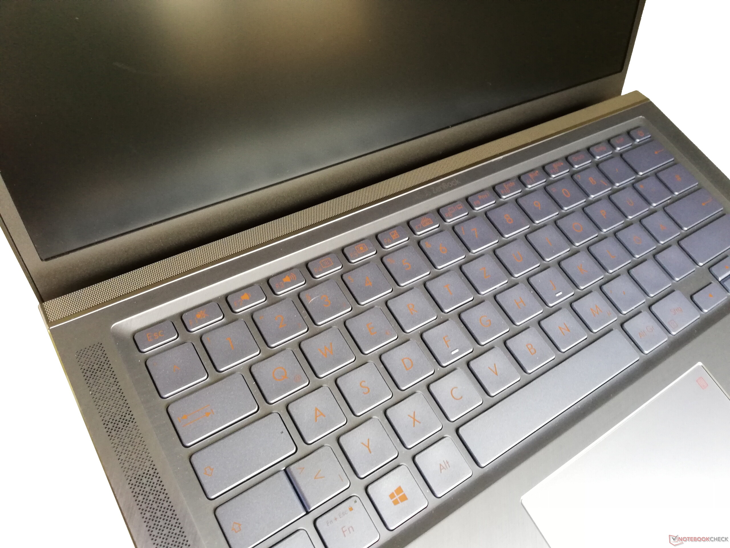 Die Tasten des ZenBook 14 UM431D haben ein Größe, die für Schreibarbeiten gut geeignet ist. Dabei ist der Druckpunkt deutlich zu spüren, durch die glatte Oberfläche werden einzelne Tasten aber nicht immer genau getroffen. Auch nach einer Eingewöhnungszeit kommt es daher immer wieder zu Fehleingaben und die sehr kleinen Funktionstasten lassen sich nur nach genauem Hinsehen auslösen. Die dreistufige Hintergrundbeleuchtung sorgt im Dunkeln für eine blendfreie Ausleuchtung der Beschriftung.