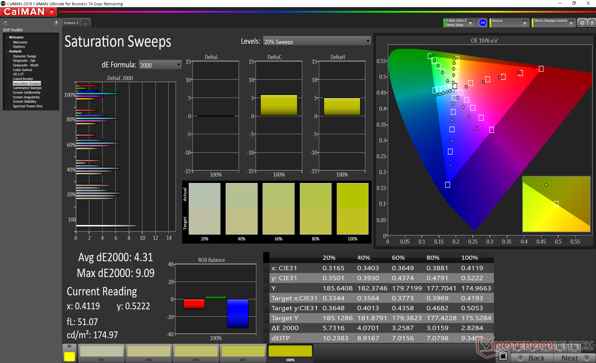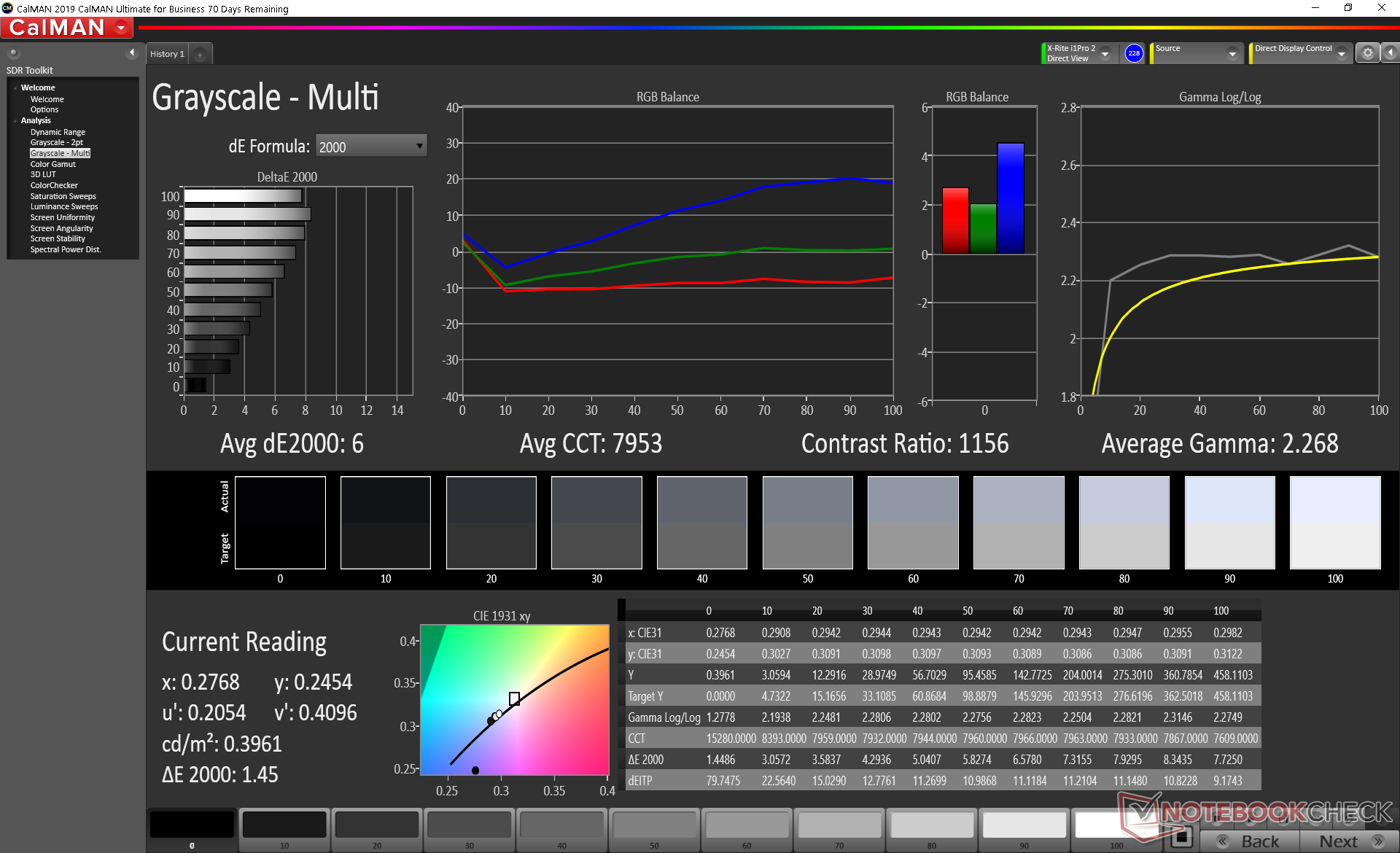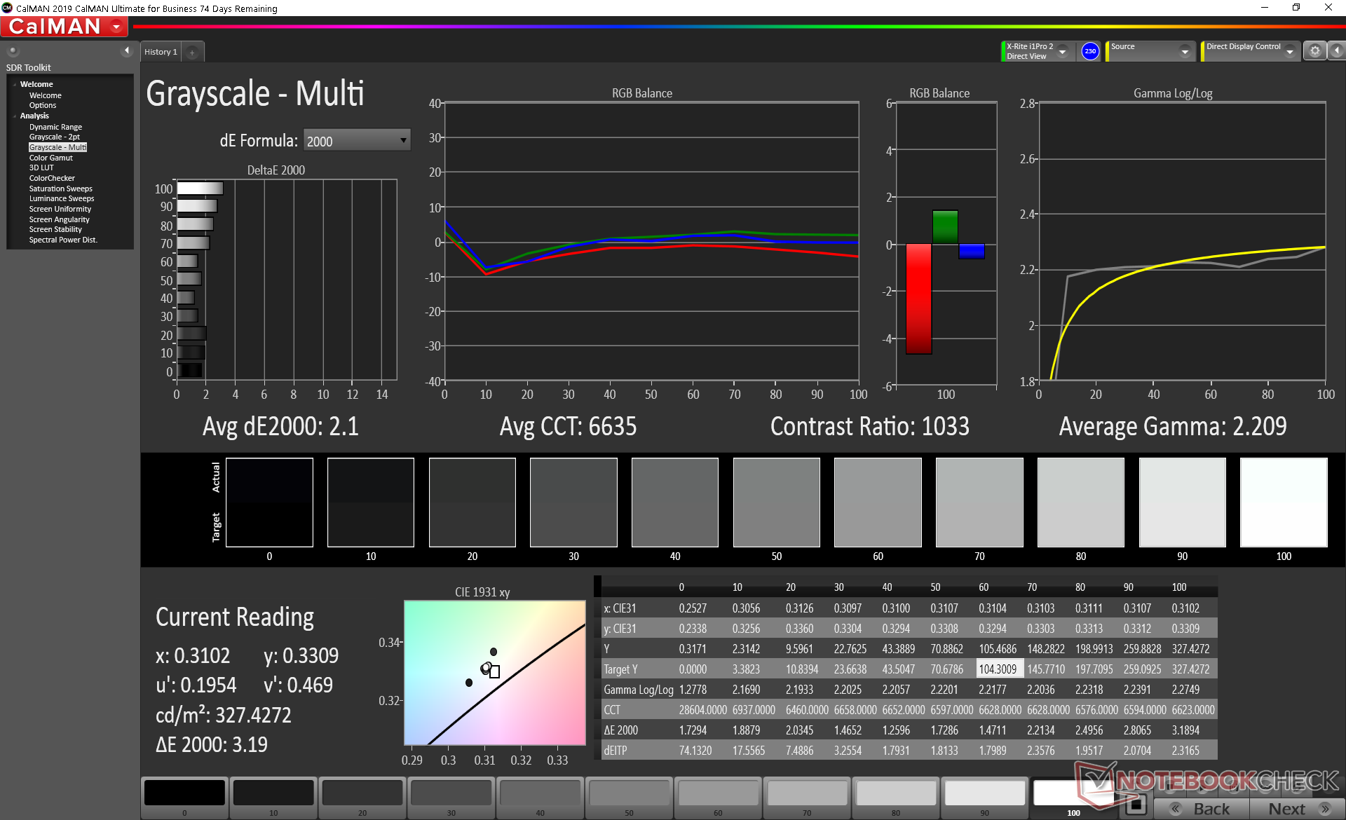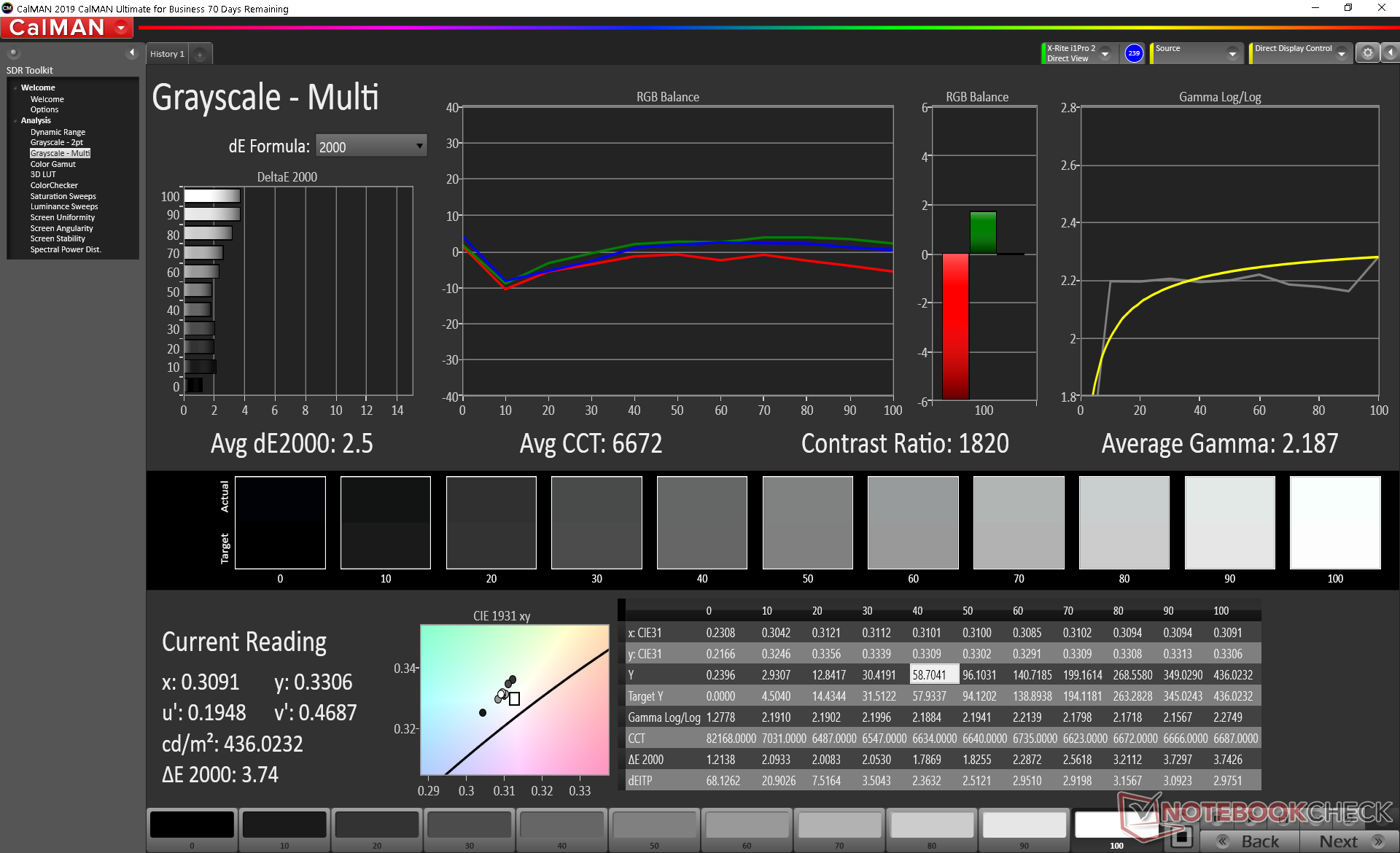 Die Auswertung des ScreenPad mit einem X-Rite Colorimeter zeigt eine Hintergrundbeleuchtung, die sogar noch heller ist als der Hauptbildschirm, was gut ist, da der Benutzer das ScreenPad fast immer aus einem breiteren Winkel als den Hauptbildschirm betrachtet. Die Farben sind nicht so gut kalibriert und die Graustufen sind übermäßig kühl, aber es ist möglich, das ScreenPad zu kalibrieren, um diese Mängel zu beheben. Farben und Graustufen verbesserten sich merklich, nachdem wir den Bildschirm selbst kalibrierten, wie unsere Screenshots unten zeigen.