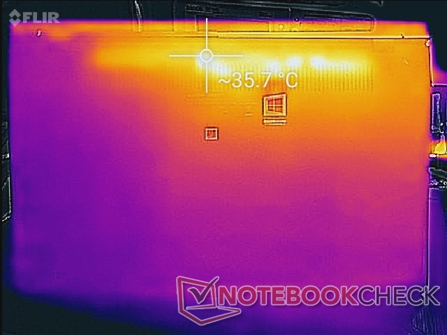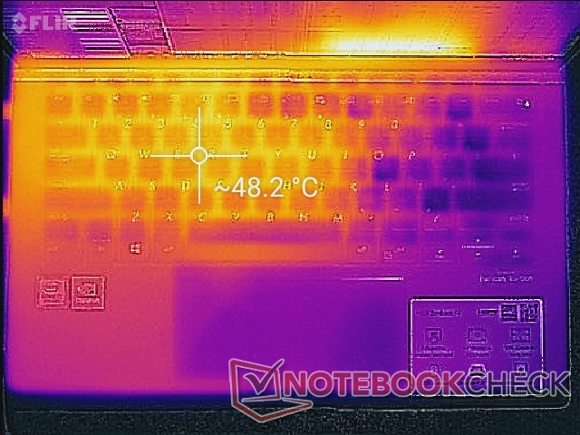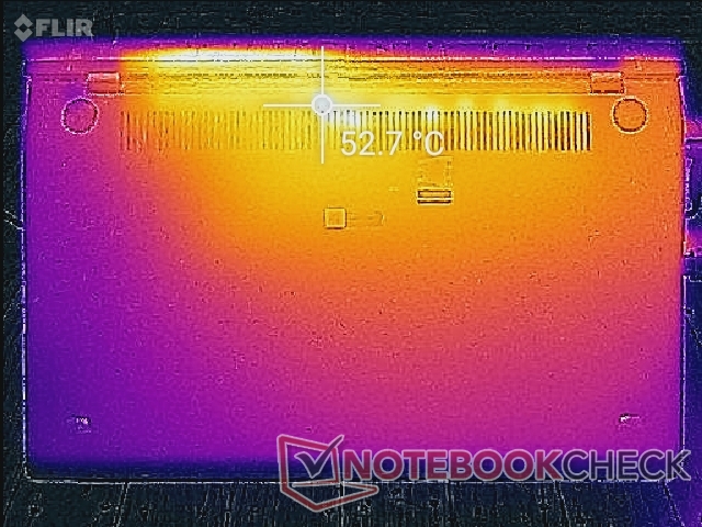 Die Oberflächentemperaturen sind nach vorne kühler, während die Rückseite im Leerlauf auf dem Desktop bis zu 36 °C warm sein kann. Heiße Stellen in der Mitte und an der Unterseite der Tastatur können bis zu 48 °C bis 53 °C warm werden, wie aus den Temperaturbildern unten hervorgeht. Diese Werte entsprechen in etwa denen des Lenovo Yoga Slim 7. Sie werden sich einen Schreibtisch wünschen, wenn Sie vorhaben, Spiele oder andere hohe Belastungen auf diesem Gerät auszuführen.
