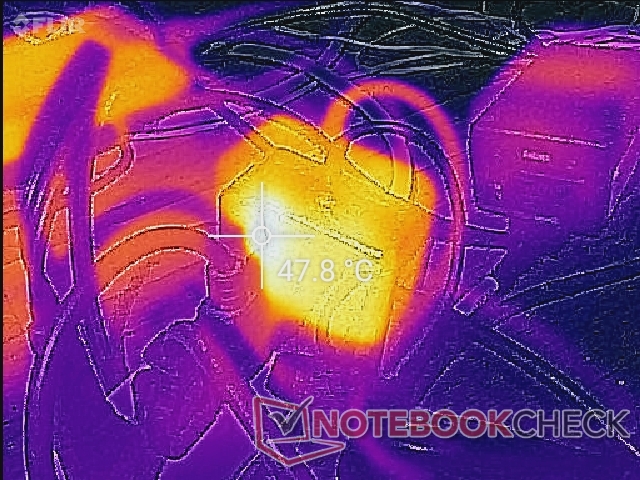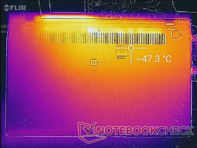 (-) Die maximale Temperatur auf der Oberseite ist 47.4 °C. Im Vergleich liegt der Klassendurchschnitt bei 35.9 °C (von 21.4 bis 59 °C für die Klasse Subnotebook).