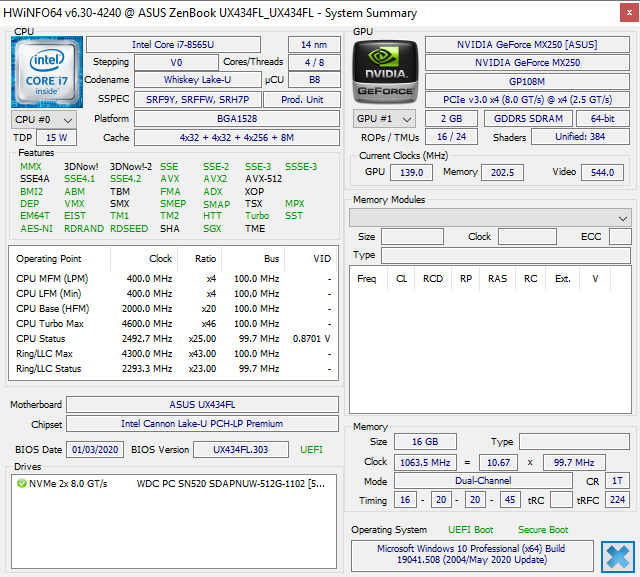 | 82.4 % v7 (old) | 09 / 2020 | Asus ZenBook 14 UX434FL-DB77 i7-8565U, GeForce MX250 | 1.3 kg | 16.9 mm | 14.00" | 1920x1080 | |