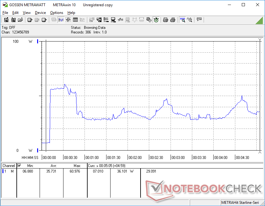 Beim Spielen werden je nach Bildfrequenz und GPU-Belastung zwischen 34 W und 47 W benötigt. Der Gesamtverbrauch ist geringer als der des Asus VivoBook S14 und des MSI Modern 14, was größtenteils auf die stromsparende 10 W GeForce MX250 in unserem Asus zurückzuführen ist.
